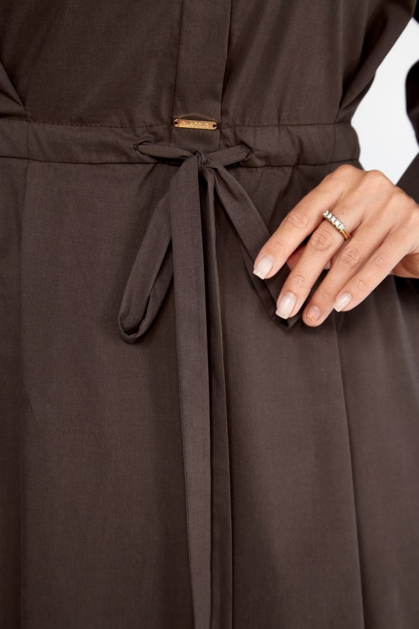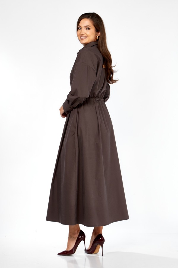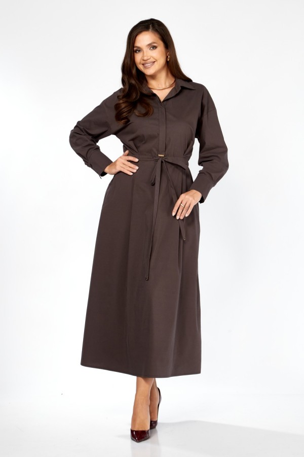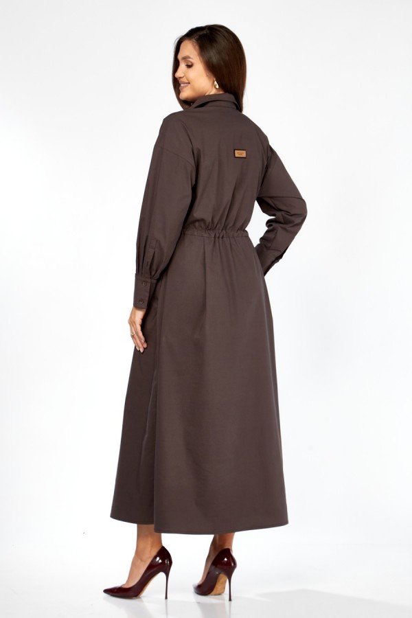 Элегантное женское платье Maxi прямого силуэта с расширенной линией низа — идеальный вариант для тех, кто ценит комфорт и современный стиль. Модель отрезная по линии талии и дополнена кулисой в шве с завязывающимся поясом шириной 2 см. Переднее и заднее полотнища юбки выполнены с двумя складками по талии, что создаёт мягкий объём и аккуратную драпировку. На лифе также расположены две складки, подчёркивающие линию талии. Линия плеча спущена на 11–12 см, рукав притачной одношовный с манжетой 10 см на трёх пуговицах. Воротник рубашечный, на стойке, застёжка до талии на потайные пуговицы. В боковых швах — удобные карманы. Декор: нашивка по переду, металлическая нашивка на планке и настрочная нашивка по спинке.