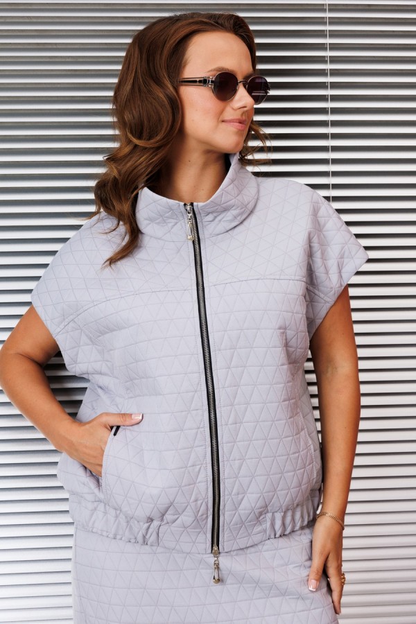 Костюм состоящий из жилета и юбки. Жилет свободного силуэта, вырез горловины со стойкой, без рукава, по переду карманы в шве рельефа. По низу изделие на резинке, застежка на тесьму-молнию. Жилет на подкладке. Юбка зауженная к низу, прилегающего силуэта. Пояс частично на резинке. По низу подрез, застежка на тесьму-молнию. Сзади разрез. Р-р 50: Длина жакета – 58см Длина юбки – 66,5см с учетом ширины пояса.
