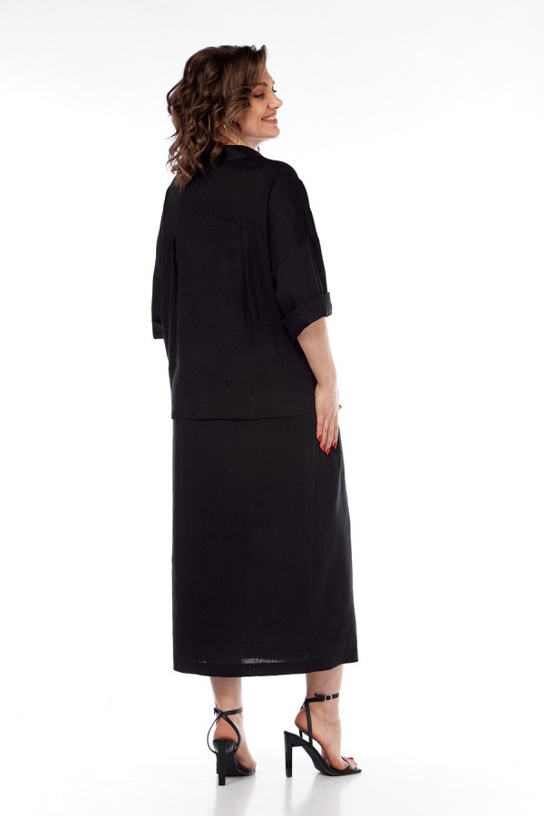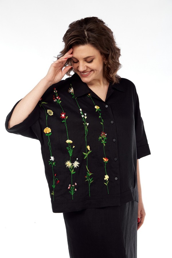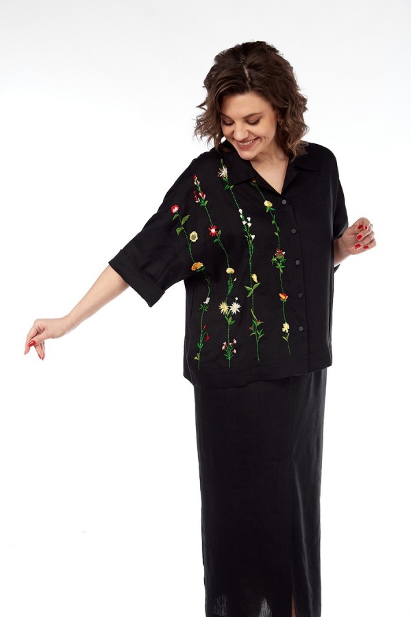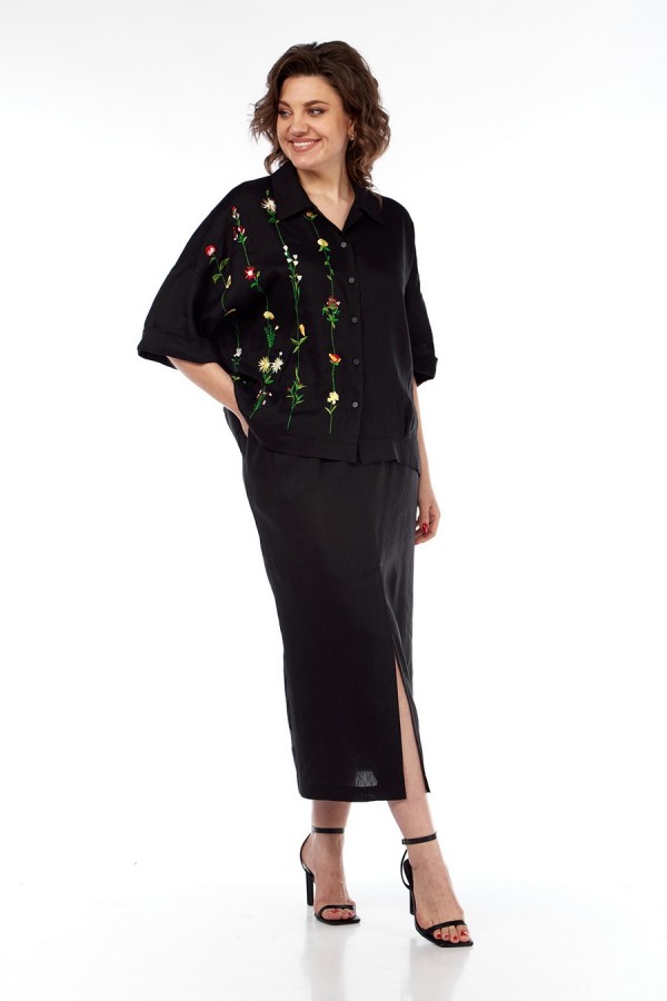 Костюм женский 2х-предметный, состоит из блузки и юбки, выполнен из натуральной ткани белорусского производства. Блузка свободного силуэта с воротником рубашечного типа и центральной застежкой на петли с пуговицами. Низ переда обработан притачной планкой. На спинке кокетка и складки. Рукава спущенные с отложными манжетами. Блузка декорирована вышивкой. Юбка прямого силуэта с притачным поясом, частично на эластичной тесьме. По переду обработаны боковые карманы, в центральном шве переда имеется шлица. Юбка на подкладке. Обращаем Ваше внимание, что цвет на экране может отличаться от реального. Состав: лен — 78%, вискоза — 22%. Описание Длина блузки по спинке — 63 см, длина плеча + рукав — 51 см. р.52 — ПОГ 68 см ПОБ 66 см, р.54 — ПОГ 70 см ПОБ 68 см, р.56 — ПОГ 72 см ПОБ 70 см, р.58 — ПОГ 74 см ПОБ 72 см. Длина юбки — 90 см. р.52 — ПОТ 38 см ПОБ 58 см, р.54 — ПОТ 40 см ПОБ 60 см, р.56 — ПОТ 42 см ПОБ 62 см, р.58 — ПОТ 44 см ПОБ 64 см.