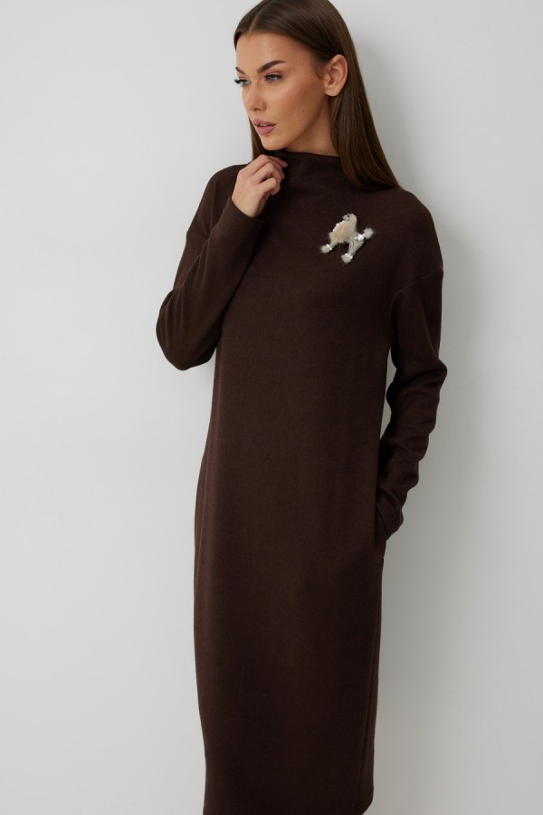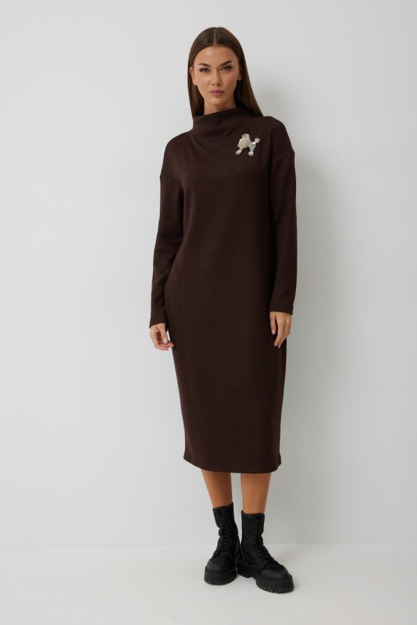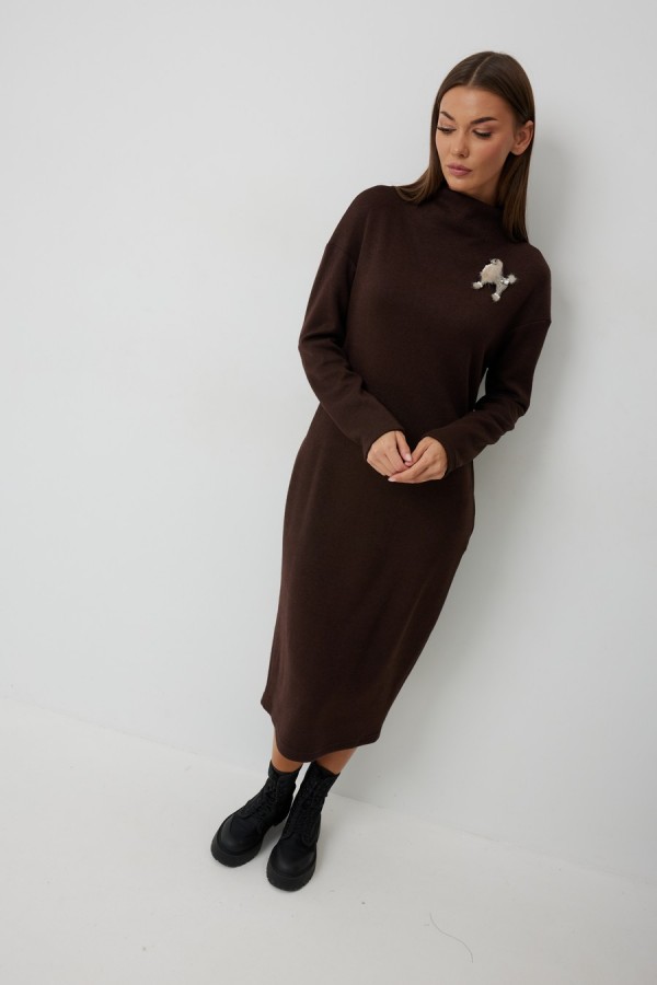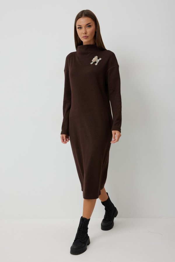 Платье трикотажное полуприлегающего силуэта с карманами в боковом шве. Длина платья до середины икры. Платье с цельнокроеной горловиной и спущенной линией плеча. Спинка со средним швом. Платье дополнено съемным авторским декором. Длина изделия по спинке 112см, длина рукава от плеча 70 см.