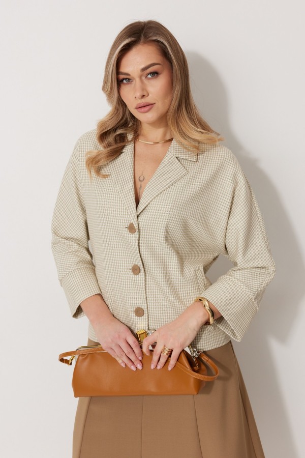 Костюм женский, состоящий из жакета и юбки. Жакет без подкладки, кроя «летучая мышь», с центральной однобортной застежкой на петли и контрастные пуговицы. По переду обработаны вертикальные прорезные карманы с листочкой. Спинка цельнокроеная. Горловина V-образной формы, обработана воротником пиджачного типа с контрастным кантом. Рукав 7/8, по низу обработан широкой притачной манжетой. Юбка женская А – силуэта длиной до середины икры. Перед юбки состоит из 4 клиньев. Вверху передней части юбки располагается карман с отрезным бочком. Спинка юбки состоит из 4 клиньев. По среднему шву юбки находится застежка – молния. Верхний срез юбки обработан обтачкой.Длина спинки жакета 60 см, длина рукава 66 см, длина юбки по боковому шву 82 см