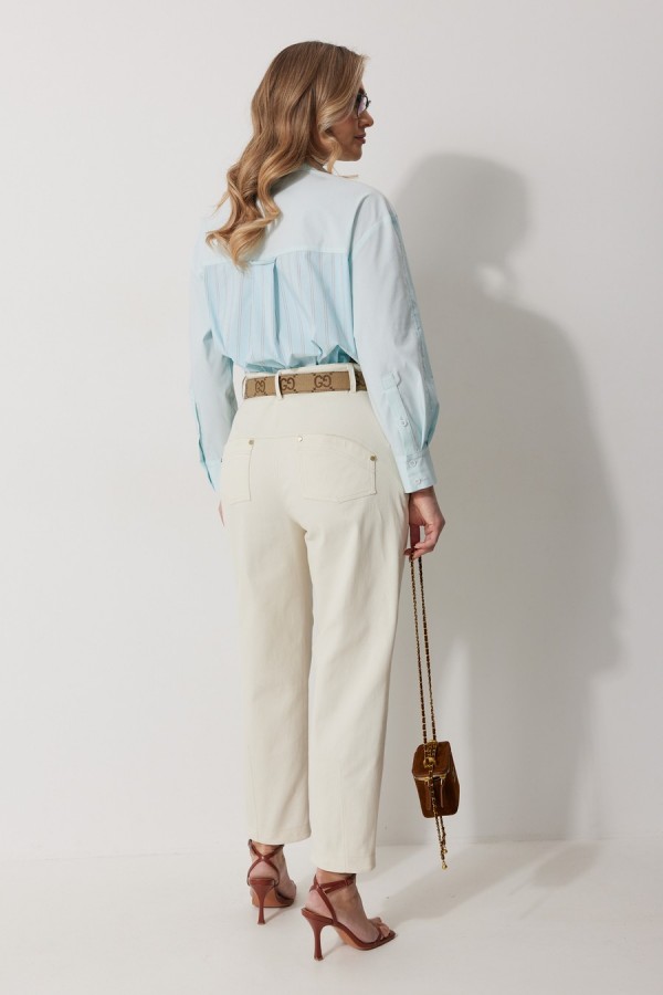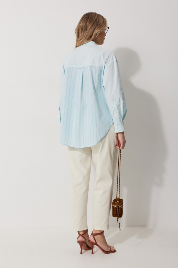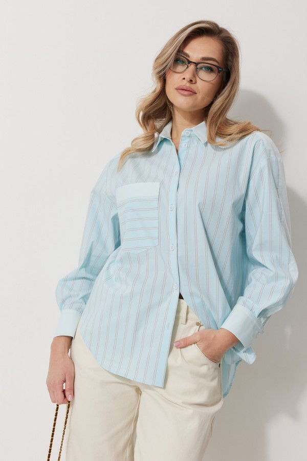 Блузка женская прямого силуэта. Полочки из ткани в полоску. На правой полочке настрочен накладной карман с комбинацией тканей. Перед обработан цельнокроеными планками с центральной застежкой на петли и пуговицы. Спинка из ткани в полоски с кокеткой из ткани компаньона. По верхней части спинки заложена бантовая складка. Плечо спущено. Рукав длинный, двухшовный. Одна часть рукава из ткани в полоску, другая из ткани компаньона. Рукав по низу со складкой, обработан широкой притачной манжетой застегивающейся на петли и пуговицы. Разрез рукава обработан притачными отрезными планками. Манжета и притачные планки из ткани компаньона. Низ разноуровневый, закругленной формы. Горловина обработана воротником рубашечного типа с отрезной стойкой из ткани компаньона.Длина спинки изделия 77 см, длина руква от горловины 74 см.