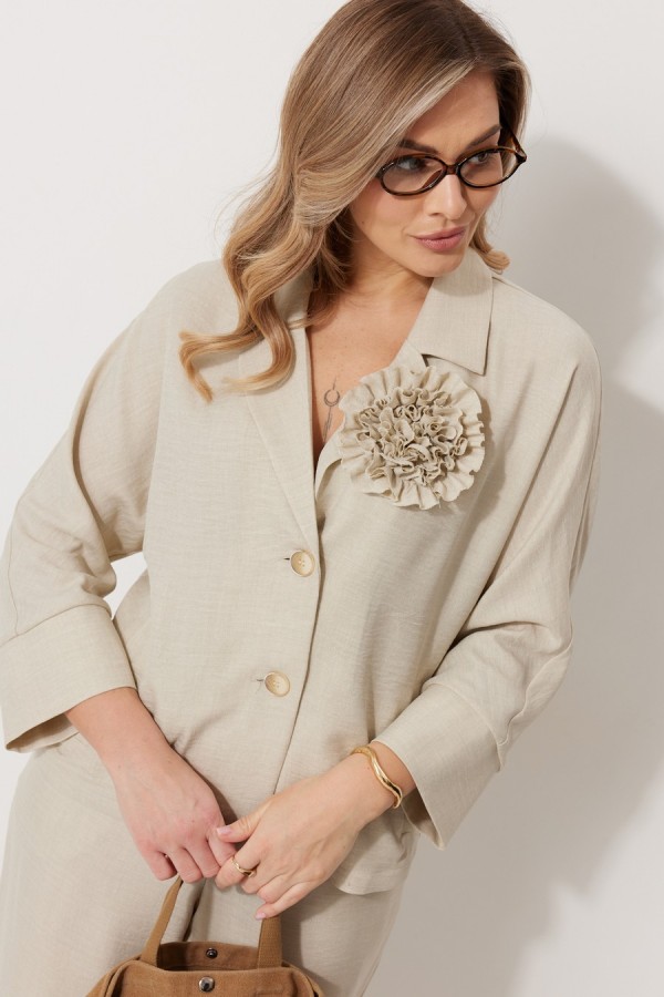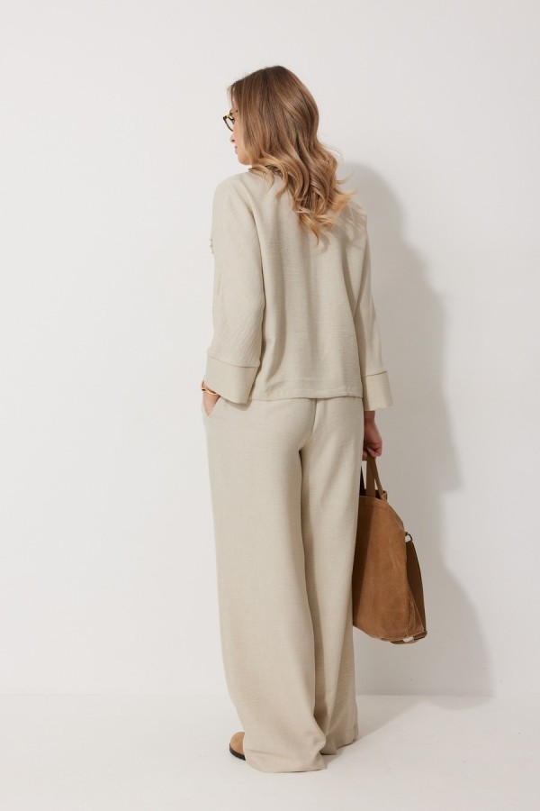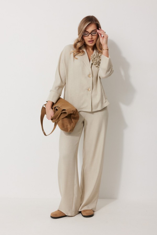 Костюм женский, состоящий из жакета и брюк. Жакет без подкладки, кроя «летучая мышь», с центральной однобортной застежкой на петли и пуговицы. По переду обработаны вертикальные прорезные карманы с листочкой. Спинка цельнокроеная, слева расположен декор в виде авторской броши. Горловина V-образной формы, обработана воротником пиджачного типа. Рукав 7/8, по низу обработан широкой притачной манжетой. Брюки женские, расширенные. По переду обработана застежка на молнию, обработаны карманы с наклонным входом. На задних половинках брюк застрочены вытачки. Верх обработан широким притачным поясом (частично на резинке), застегивающимся на петлю и пуговицу. Длина спинки жакета 58 см, длина рукава 66 см, длина брюк по боковому шву 109 см.