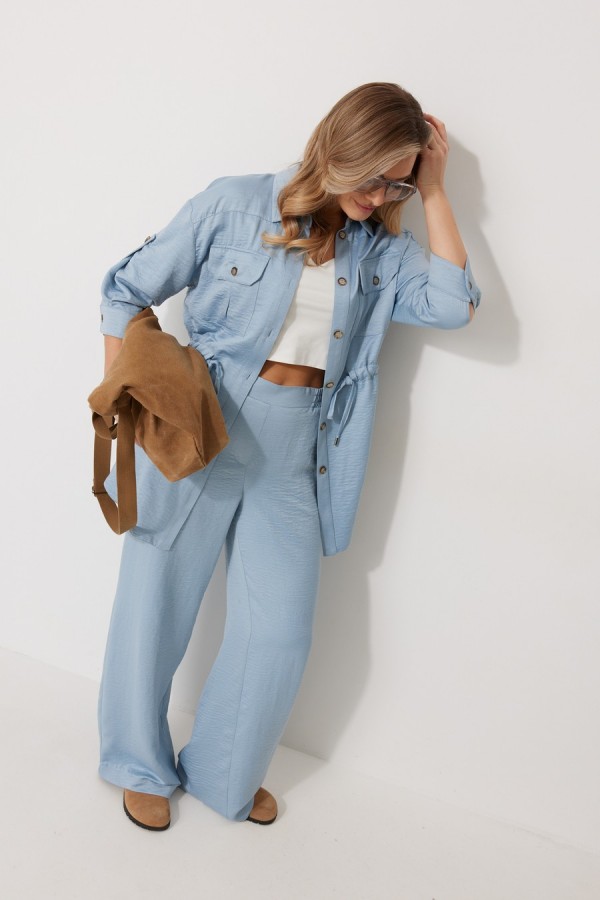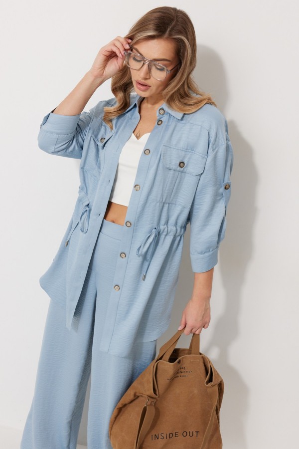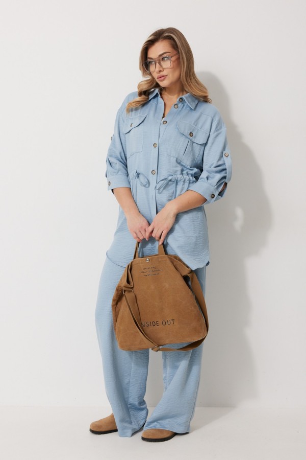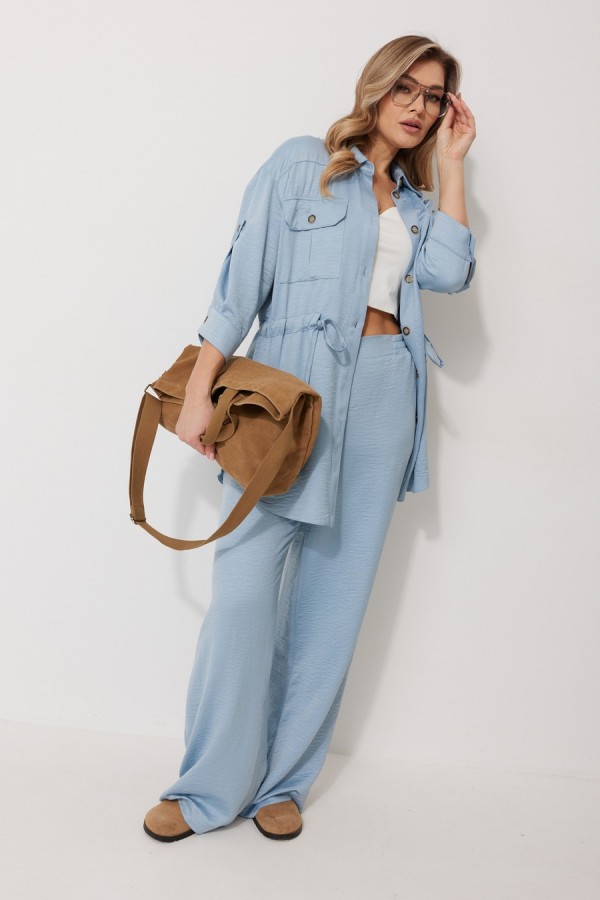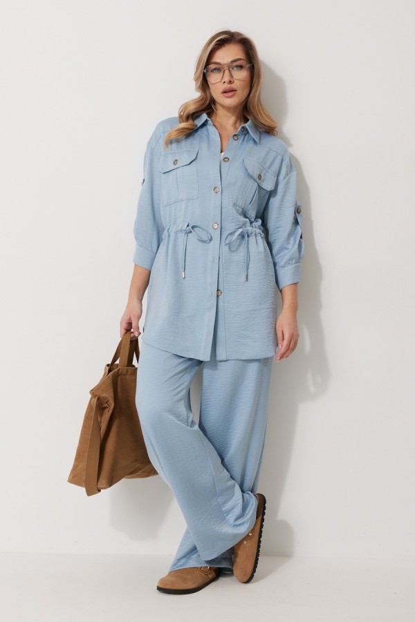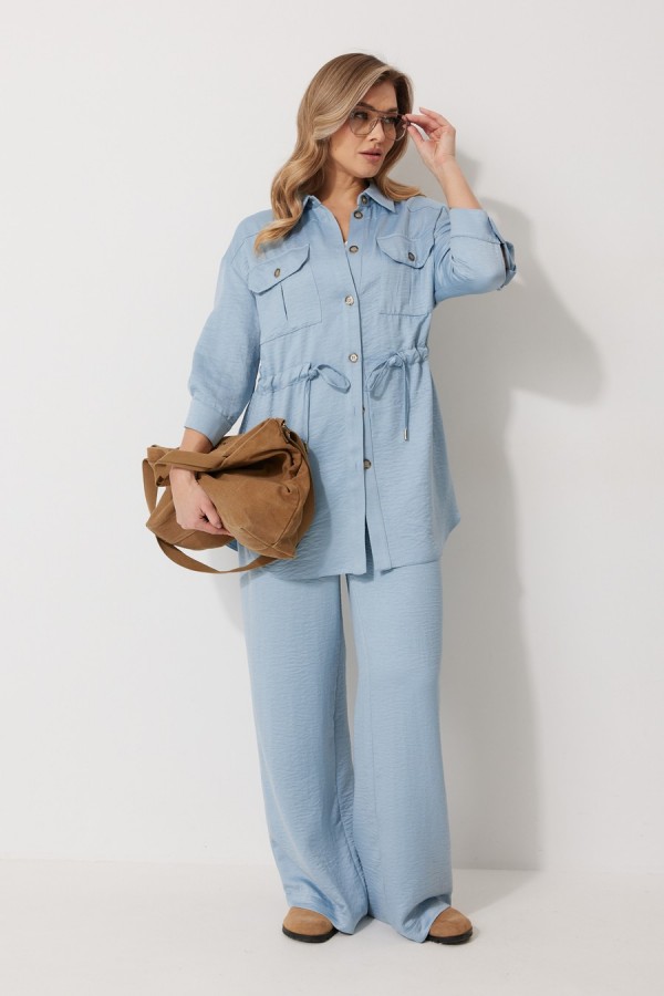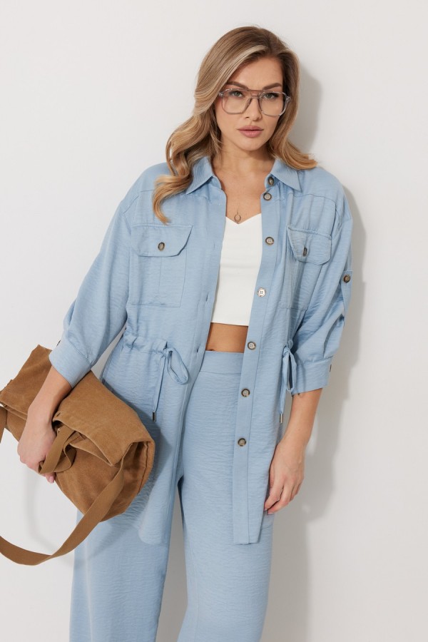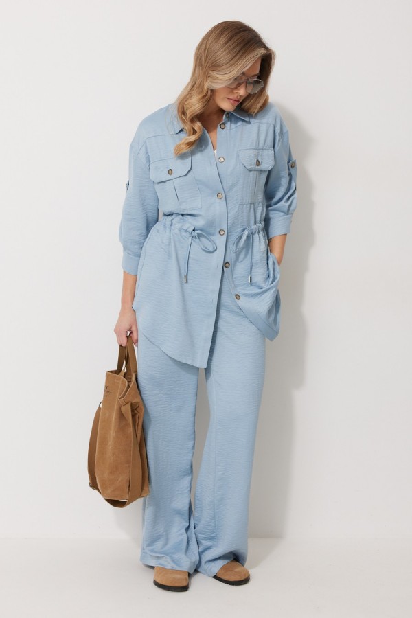 Костюм женский состоящий из блузки с брюками. Блузка прямого силуэта, по спущенной линией плеча, длиной за линию бедра. По переду блузки настрочены накладные карманы с клапаном. Клапан застегивается на петлю и пуговицу. По спинке отрезная кокетка с декоративным элементом. По переду и спинке, в районе талии располагается кулиска. Рукав втачной двухшовный ¾ длины. Низ рукава со складкой обработан притачной манжетой, застегивающейся на петлю и пуговицу. В разрезе рукава располагается пата, застегивающаяся на петлю и пуговицу. Застежка блузки центральная на отрезные планки, застегивающиеся на петли и пуговицы. Горловина блузки обработана рубашечным воротником с отрезной стойкой. Брюки женские, прямого силуэта. По переду обработана имитация застежки. Карманы расположены в боковом шве. На задних половинках брюк застрочены вытачки. Верх обработан притачным поясом (частично на резинке).Длина спинки жакета 81 см, длина рукава 57 см, длина брюк по боковому шву 109 см.