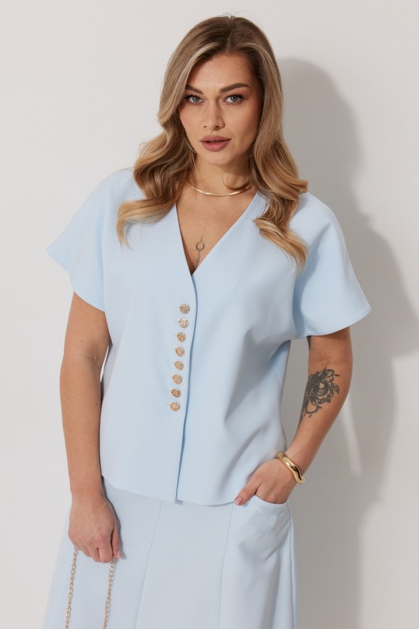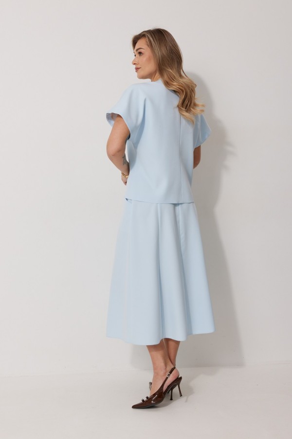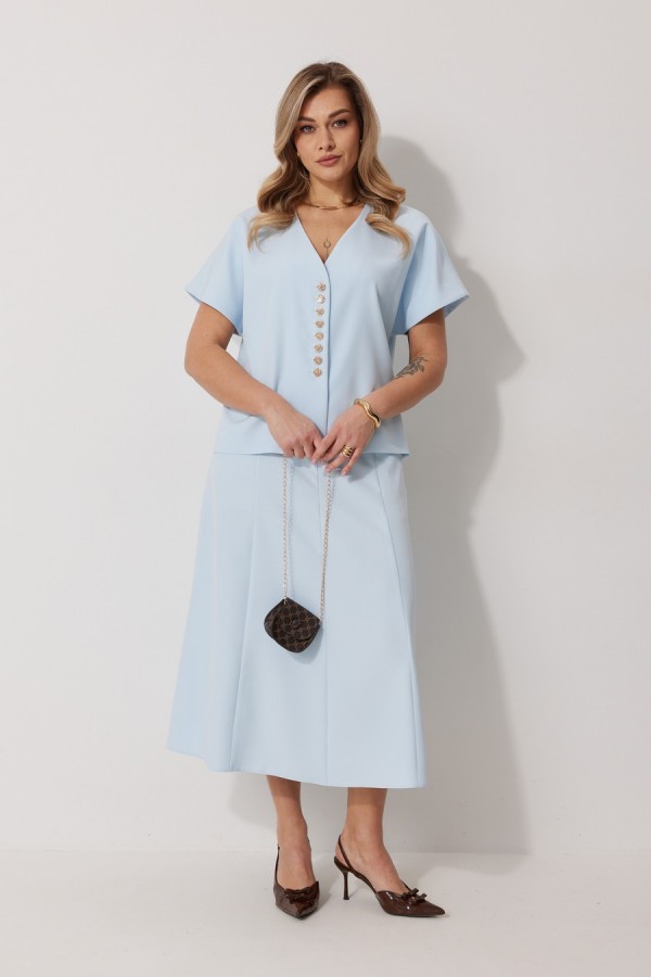 Костюм женский, состоящий из жилета и юбки. Жилет прямого силуэта на подкладке со спущенной линией плеча длиной до линии бедра. Спинка с центральным швом. Горловина V-образной формы обработана подбортом с обтачкой. Застежка жилета центральная на декоративные пуговицы. Юбка на подкладке женская А – силуэта длиной до середины икры. Перед юбки состоит из 4 клиньев. Вверху передней части юбки располагается карман с отрезным бочком. Спинка юбки состоит из 4 клиньев. По среднему шву юбки находится застежка – молния. Верхний срез юбки обработан обтачкой.Длина спинки жакета 61 см, длина рукава 34 см, длина юбки по боковому шву 82 см.