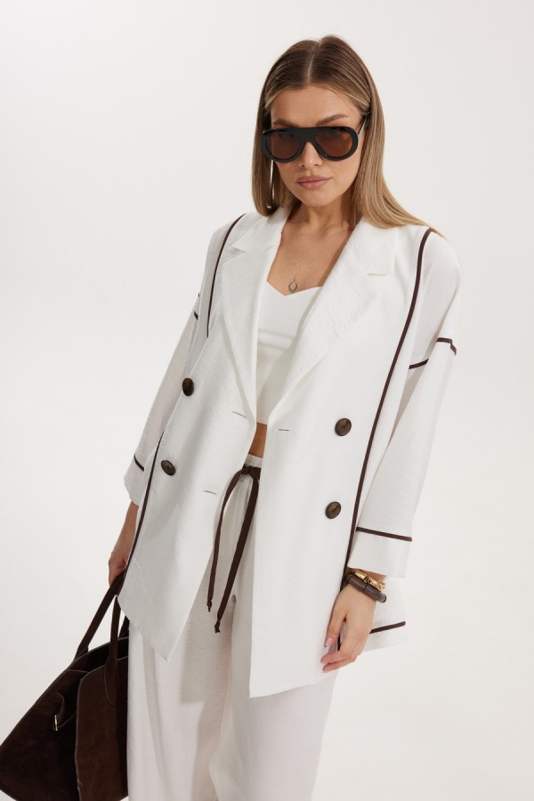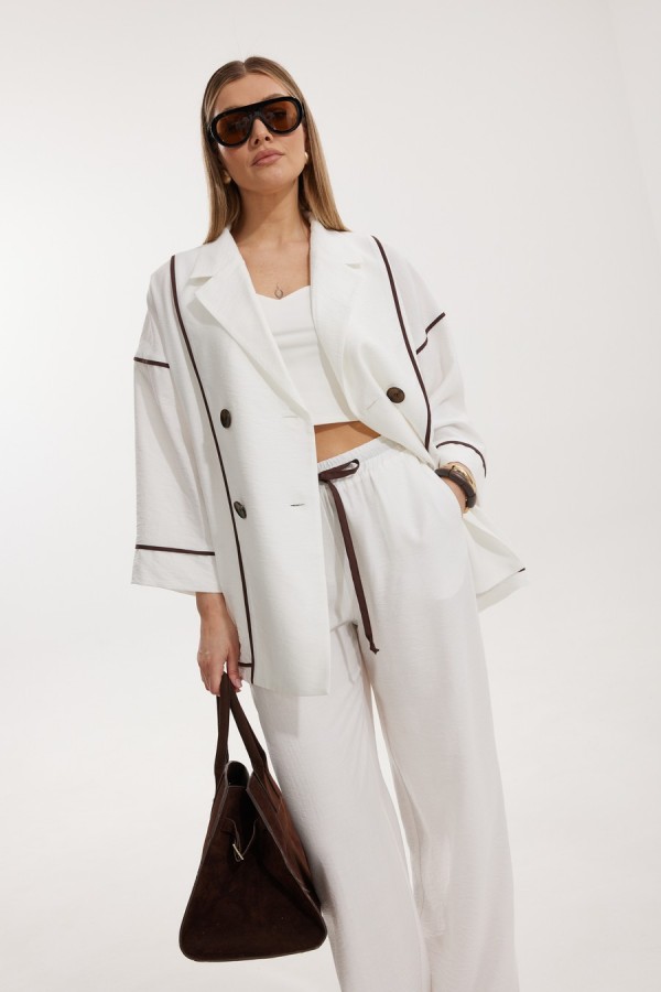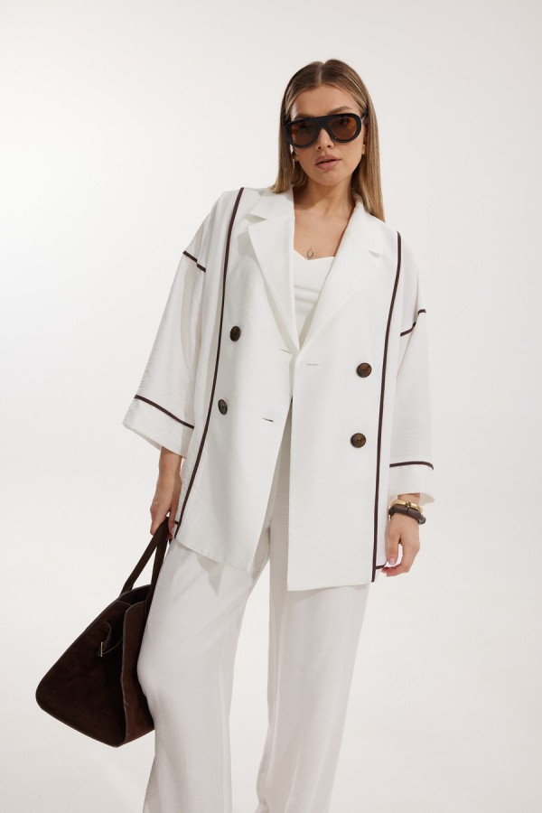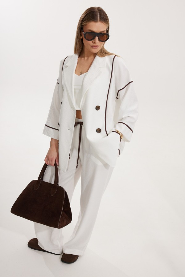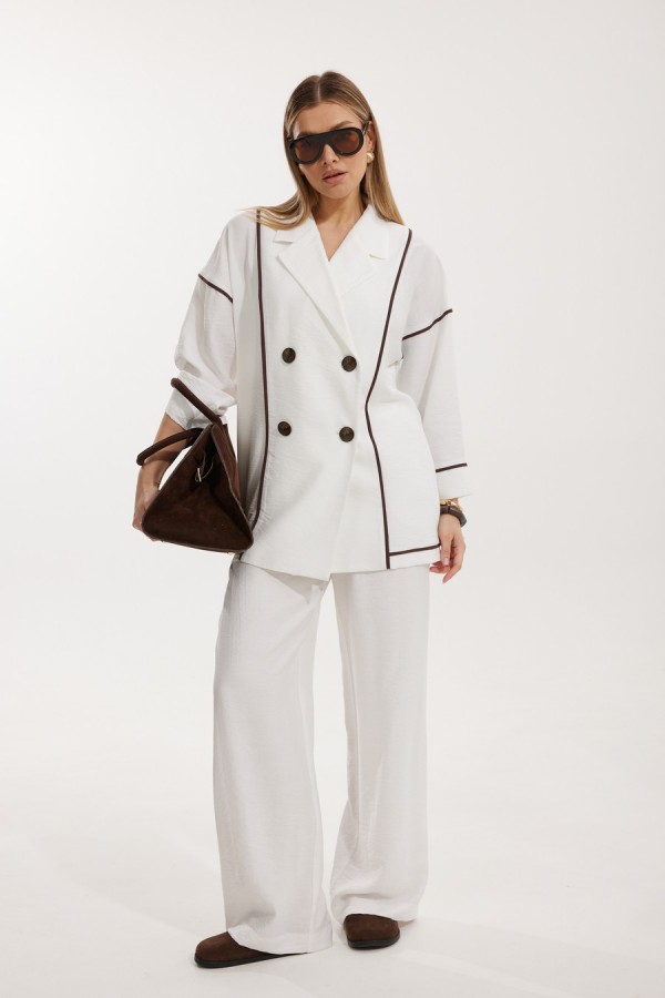 Жакет женский двубортный без подкладки прямого силуэта со спущенной линией плеча длиной за линию бедра. Перед жакета состоит из центральной и боковой части, между ними вставлен контрастного цвета отделочный кант. Спинка состоит из центральной и боковых деталей, в швах располагаются детали канта, контрастного цвета. Рукав втачной одношовный, по низу рукава пришита отрезная манжета, в швах располагается контрастный кант. Горловина обработана отрезным воротником с лацканом. Застежка двубортная на отделочные контрастные пуговицы. Брюки прямого силуэта с карманами в боковом шве и имитацией гульфика. На задних половинках брюк застрочены вытачки. Пояс притачной на резинке со шнуром в цвет отделочного канта. Длина спинки изделия 71 см, длина рукава 66,5 см, длина брюк по боковому шву 110 см.