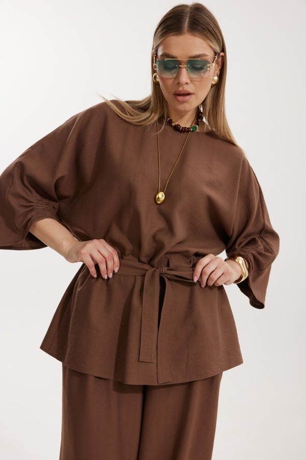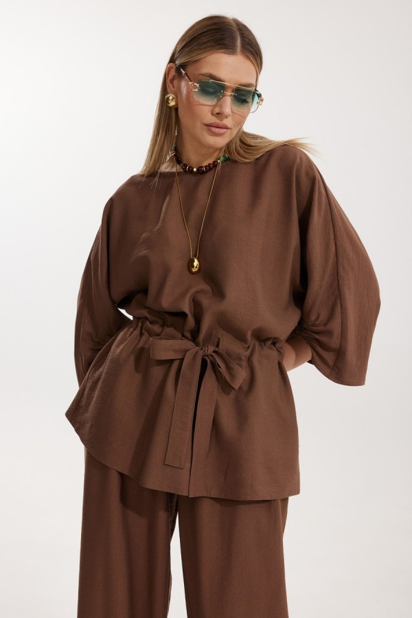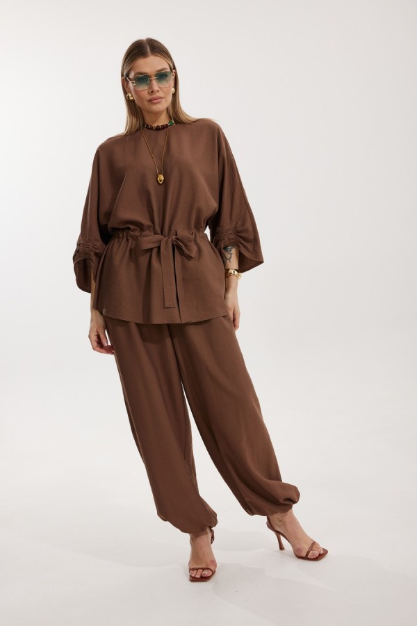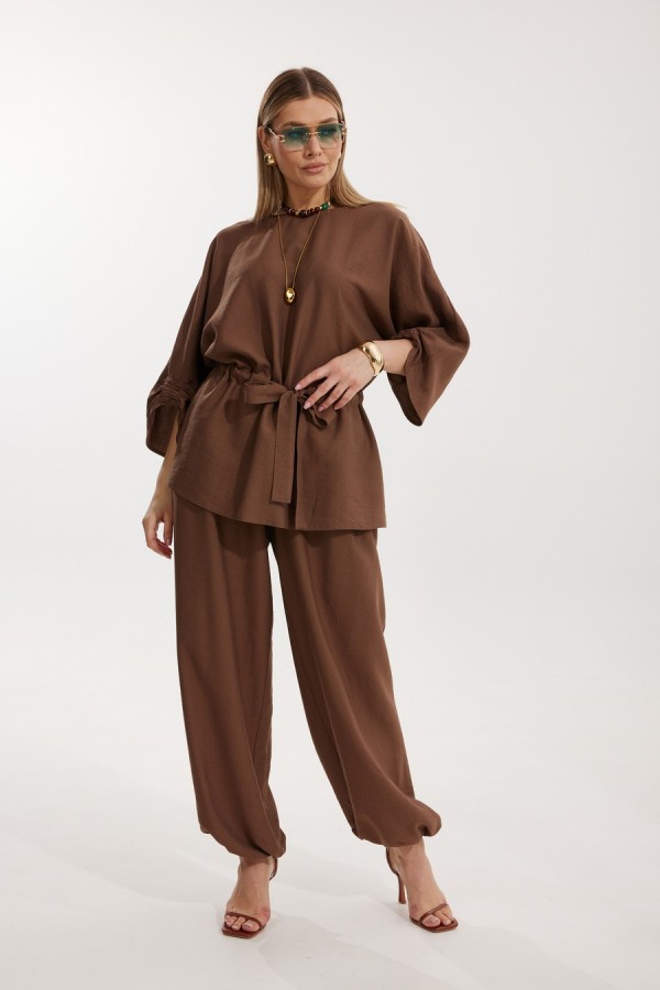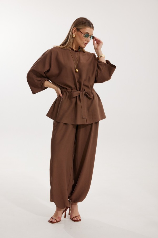 Костюм женский, состоящий из блузы и брюк. Блуза кроя «летучая мышь» длиной за линию бедра. Перед цельный с округлой горловиной. Спинка со средним швом. В районе талии обработана кулиса с широким поясом. По низу рукава по передней части выполнено несколько рядов сборки. Горловина обработана окантовкой. Брюки прямого силуэта с поясом на резинке. По передним половинкам заложены складки и обработаны наклонные карманы с отрезным бочком По низу брюки собраны на резинку. Верхний срез брюк обработан отрезным поясом на частичной резинке. Длина спинки изделия 73 см, длина рукава 61 см, длина ,h.r по боковому шву 110 см.