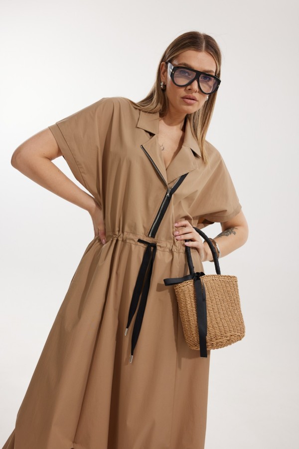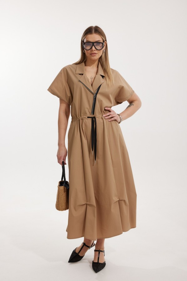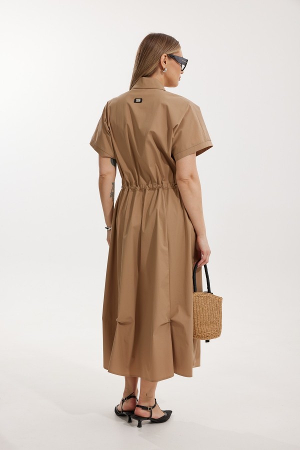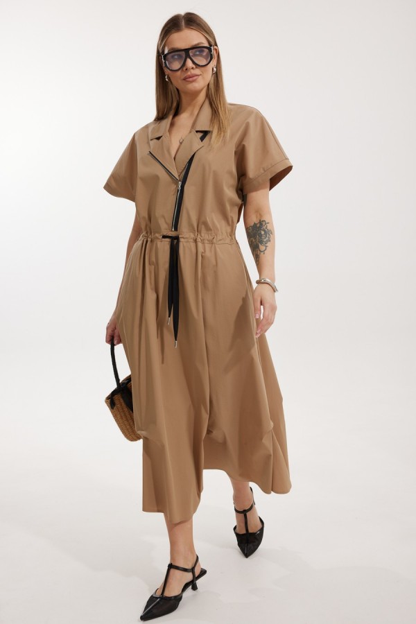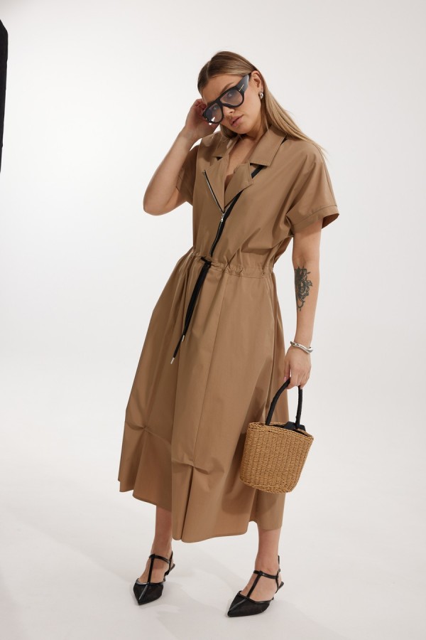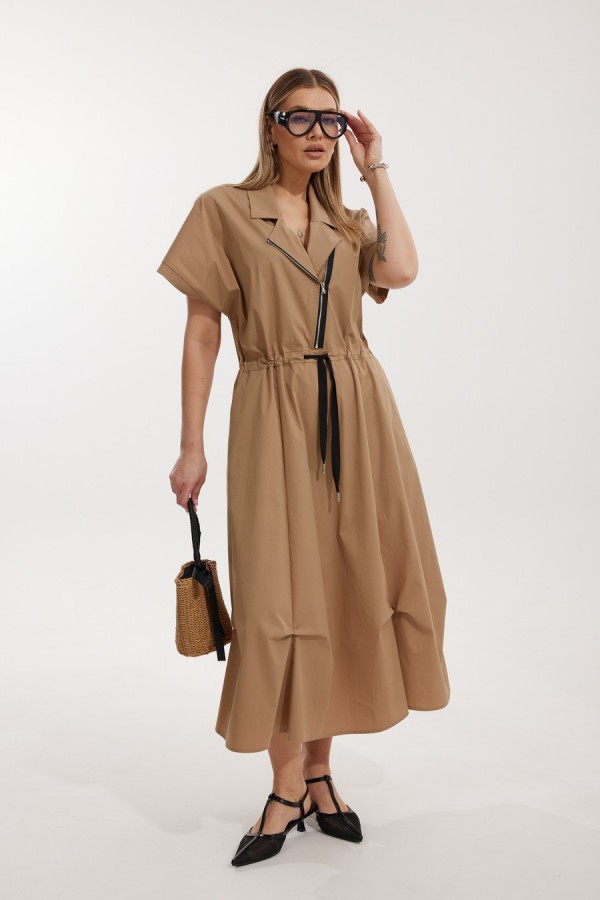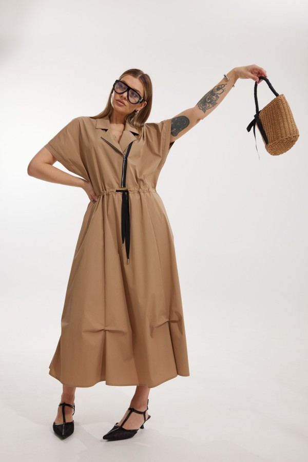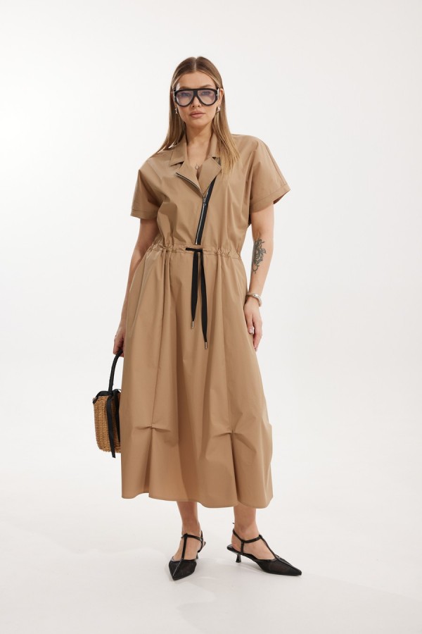 Платье женское полуприлегающего силуэта Отрезное по линии талии со спущенной линией плеча. По переду отрезного лифа платья располагается декоративная застежка-молния. Спинка лифа цельная, отрезная. Горловина обработана отрезным втачным воротником с лацканами пиджачного типа. Отрезная юбка состоит из 6 клиньев и наклонных карманов с отрезным бочком. Лиф и юбка соединены через отрезной пояс, в котором располагается кулиса с контрастным шнуром. По низу юбки застрочены защипы. Длина платья по спинке 127 см, Длина рукава по горловине 34 см.