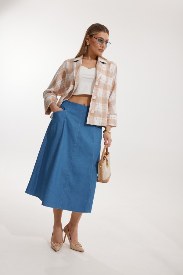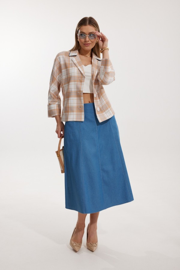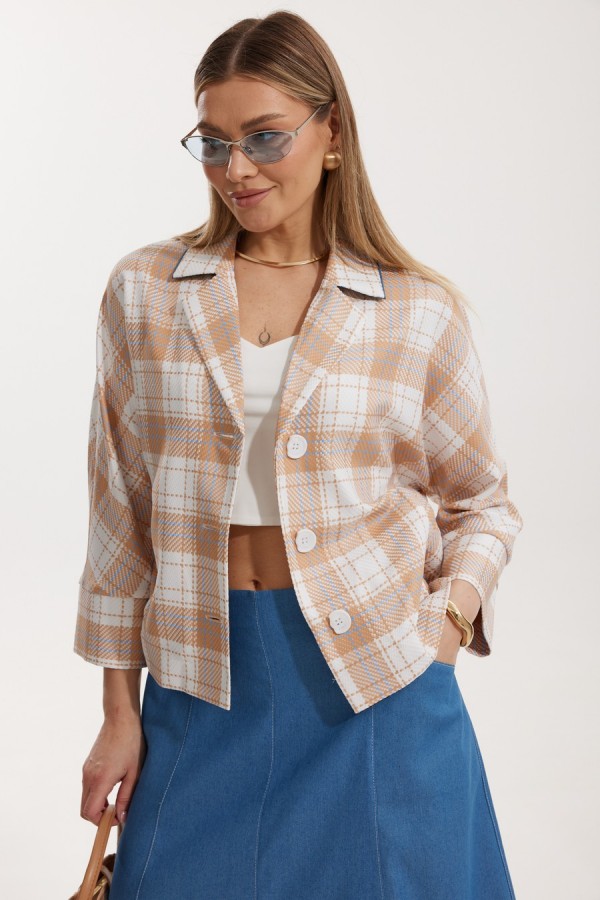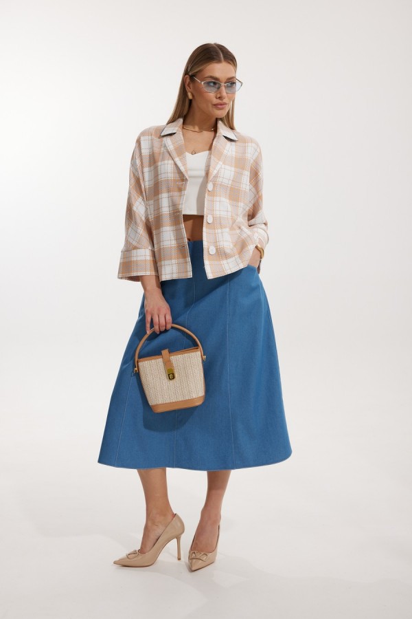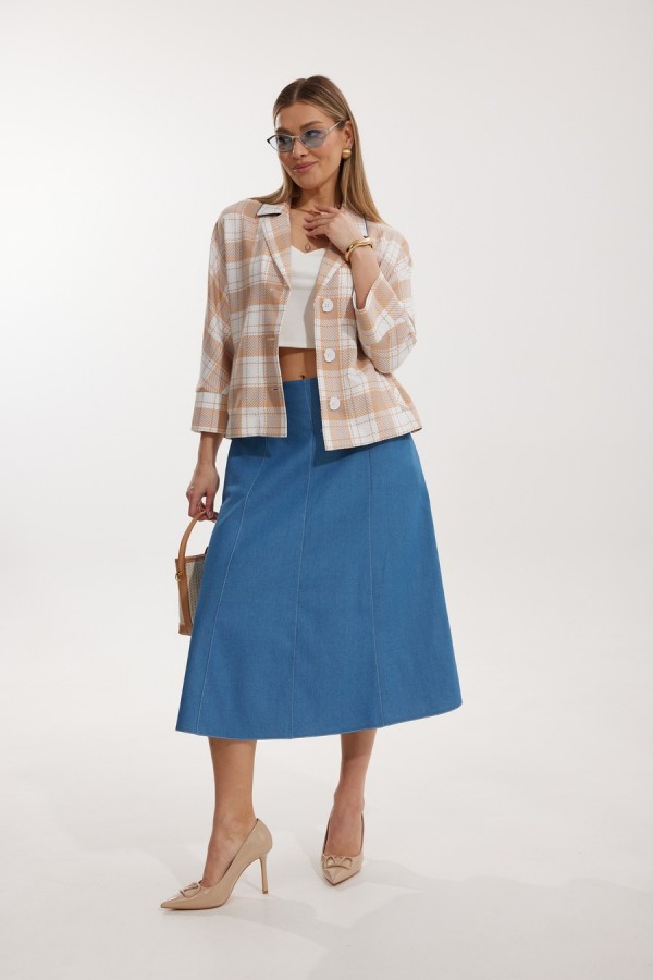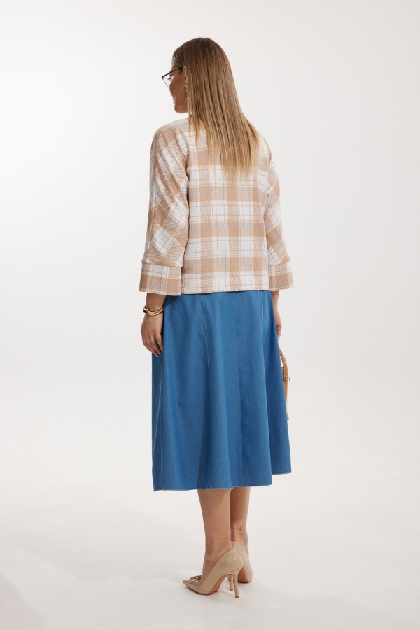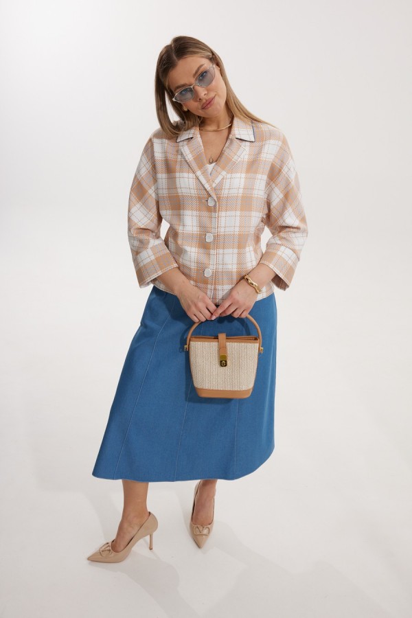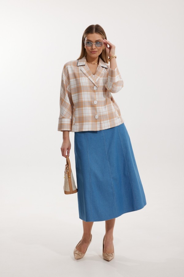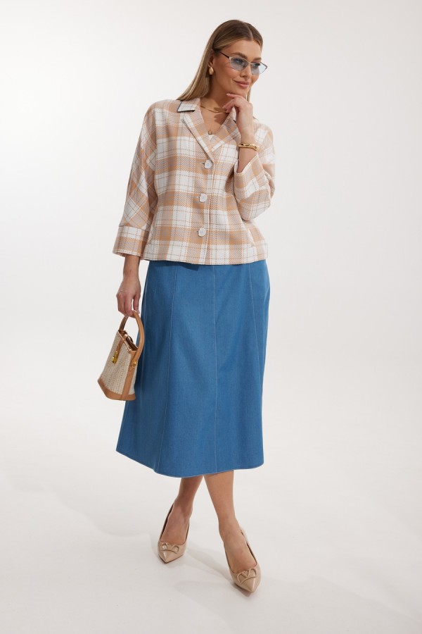 Костюм женский, состоящий из жакета и юбки. Жакет в клетку без подкладки, кроя «летучая мышь», с центральной однобортной застежкой на петли и контрастные пуговицы. По переду обработаны вертикальные прорезные карманы с листочкой. Спинка цельнокроеная. Горловина V-образной формы, обработана воротником пиджачного типа с контрастным кантом. Рукав 7/8, по низу обработан широкой притачной манжетой. Юбка женская А – силуэта длиной до середины икры. Перед юбки состоит из 4 клиньев. Вверху передней части юбки располагается карман с отрезным бочком. Спинка юбки состоит из 4 клиньев. По среднему шву юбки находится застежка – молния. Верхний срез юбки обработан обтачкой. Длина спинки изделия 58 см, длина рукава 65,5 см, длина юбки по боковому шву 80 см.