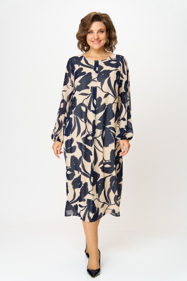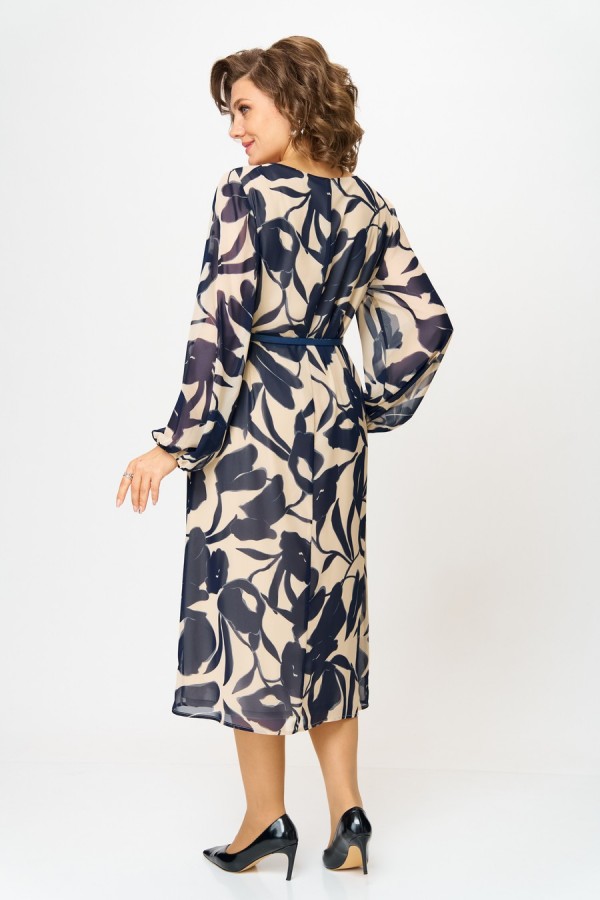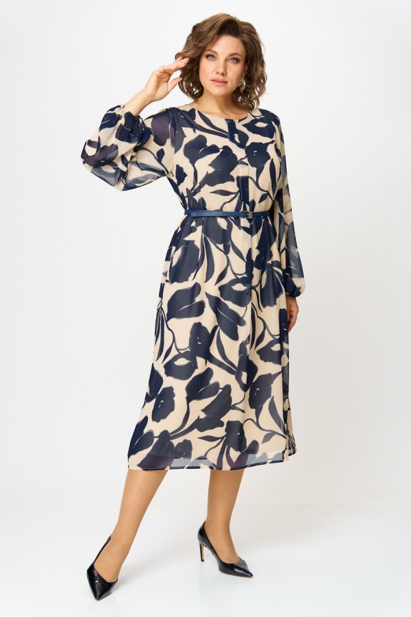 Платье выполнено из шифона с цветочным принтом. Силуэт прямой, чуть расширен к низу. По переду в горловину входит складка, складка частично настрочена. По переду есть нагрудные вытачки. Перед и спинка на трикотажной подкладке. Рукав втачной, прямой, к низу расширен. Низ рукава на резиночке. Спинка со средним швом, без особенностей. Съёмный пояс в комплекте.