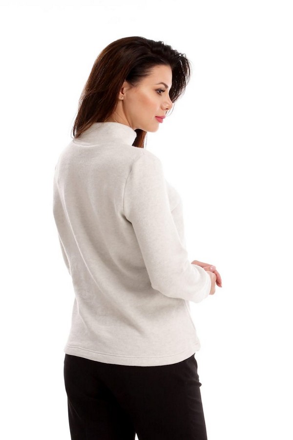 Блуза прямого покроя выполнена из мягкого трикотажного полотна, рукав втачной одношовный, заканчивается манжетой.Воротник стойка, блуза без застежки.Длина спинки по центру 65 см.Изделие не дает усадку, малосминаемое, не вытягивается. Бережная стирка при 30 градусах!