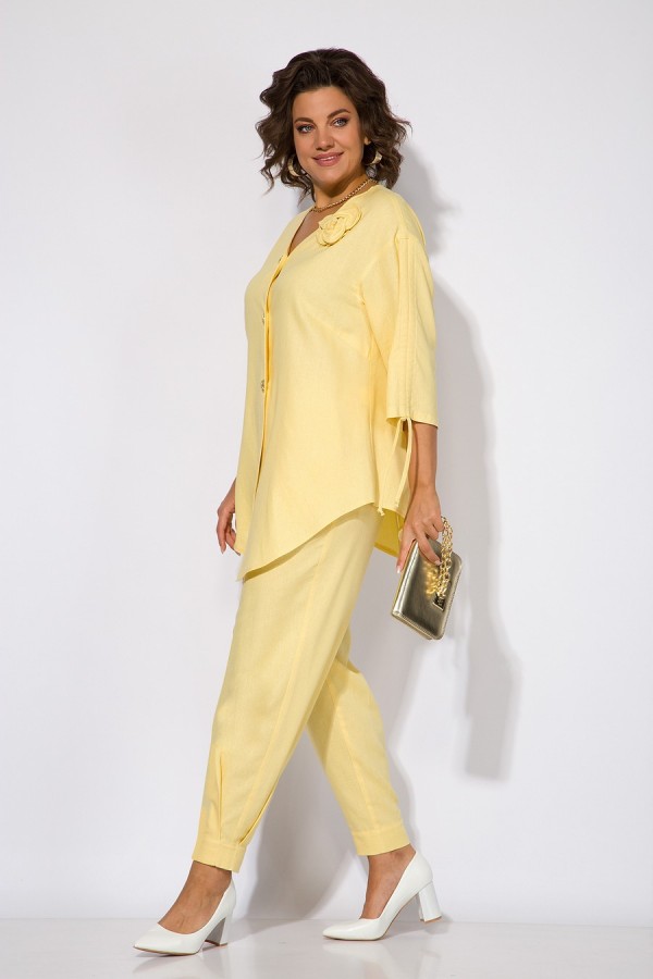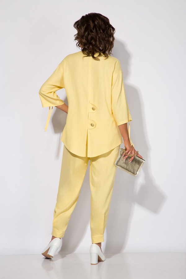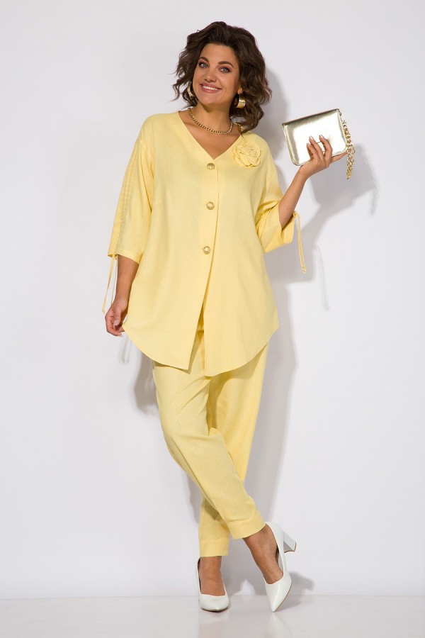 Эффектный летний костюм, из натурального льна с добавлением вискозы; состоит из свободной блузки и брюк. Блузка свободного силуэта, со спущенной линией плеча и рукавом длиной ¾-ти. Модель c V-образной линией горловины с центральной застежкой на петли и пуговицы. По центру рукава расположена кулиска с утяжкой на шнуровку. Спинка с центральным швом, переходящий в шлицу с декоративными клапанами на пуговицах. Брюки в костюме с завышенной посадкой, на притачном поясе с круговой резинкой. По бокам имеются рабочие карманы. Низ брюк с заложенными складками. Отличный вариант на жаркую солнечную погоду; для особого случая и легкого променада! Длина по спинке – 80 см. Рукав – 40 см. Брюки – 96-98 см.