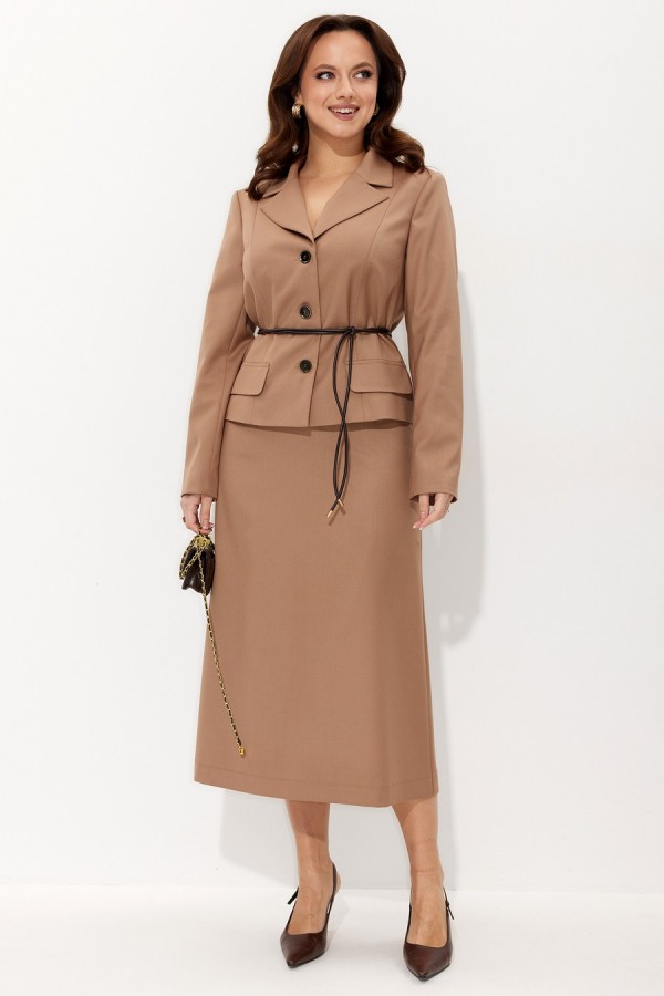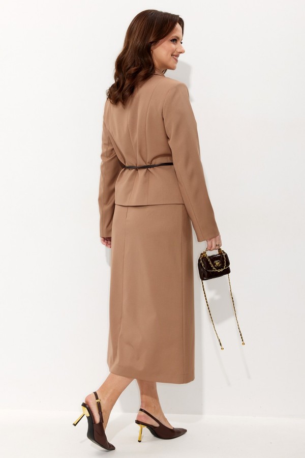 Костюм выполнен из костюмной ткани средней плотности. Жакет полуприталенного силуэта с центральной бортовой застежкой на 3 петли и пуговицы. Воротник пиджачного типа с отложными лацканами. По переду и по спинке жакета рельефы от плечевого шва. По переду жакета настрочные клапаны. Рукав втачной двухшовный. Юбка А-образного силуэта, длиной миди. Застежка в юбке на потайную тесьму-молнию в среднем шве заднего полотнища. Верхний срез юбки обработан притачным поясом. По бокам пояса вставлена эластичная тесьма. Жакет и юбка на подкладке. Ремень в комплект не входит. Длина жакета по спинке: 55 см. Длина рукава: 62 см. Длина юбки по боковому шву: 82 см.