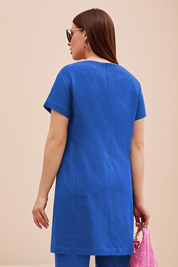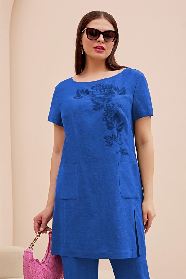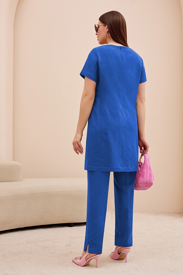 Минималистичный дизайнерский комплект с вышивкой выполнен из натурального льна. Удлиненная блузка прямого силуэта с накладными карманами и округлым вырезом украшена авторской вышивкой с цветочным мотивом. Перед оформлен отрезными бочками с нагрудными вытачками, спинка со средним швом. Застежка на потайную молнию в среднем шве спинки. Рукава втачные. Прямые брюки средней посадки с отрезным поясом на резинке по спинке и бокам , по низу в боковых швах обработаны разрезы. Застежка обработана по классической технологии (гульфик с молнией и пуговица на поясе).