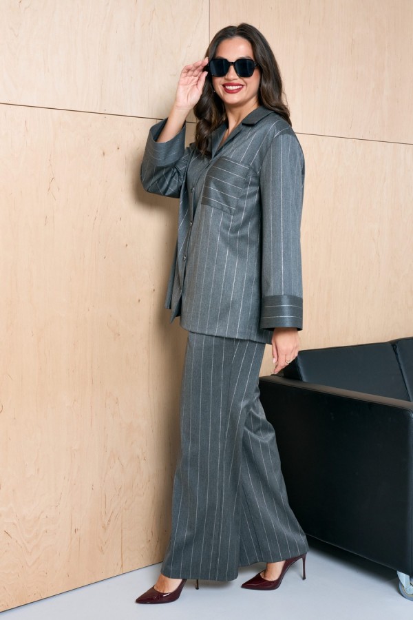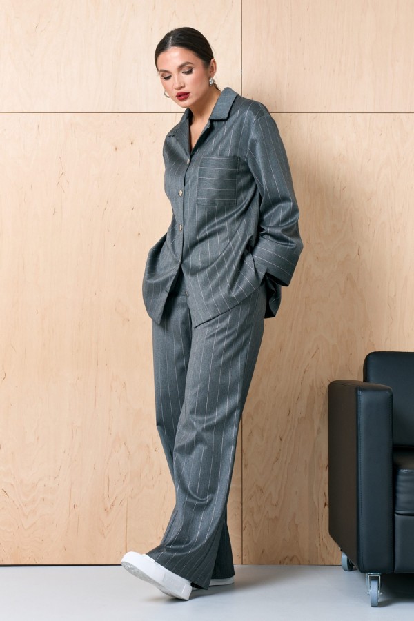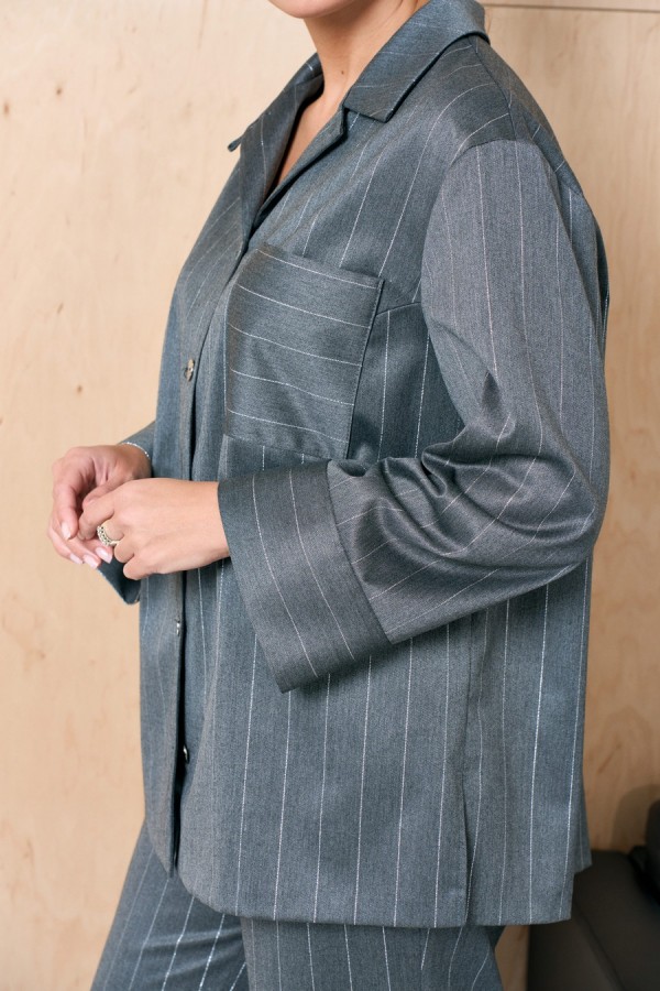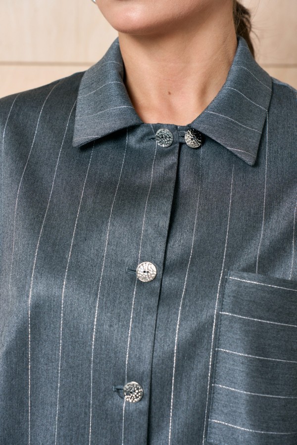 Блуза-рубашка со стояче-отложным воротником и центральной застёжкой на петли и пуговицы. По боковым швам разрезы. Перед с накладным карманом в верхней части. Спинка с кокеткой и складкой от неё. Рукава втачные с манжетами по низу.