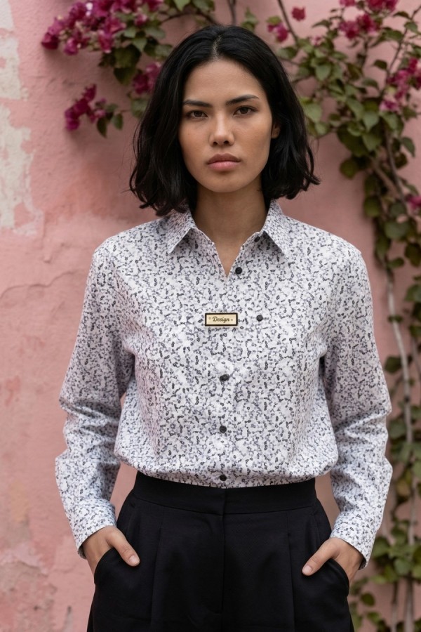 Блуза -рубашка со стояче отложным воротником и центральной застёжкой на петли и пуговицы. Перед с накладным карманом и декоративной деталью с застёжкой на пуговицу. Спинка с отрезной кокеткой и складкой от неё. Рукава втачные с манжетами по низу.