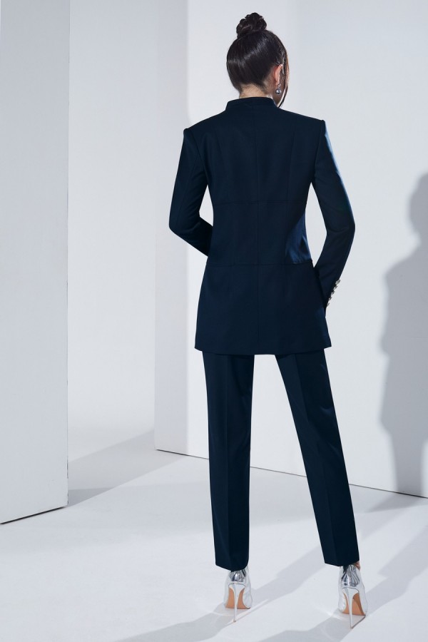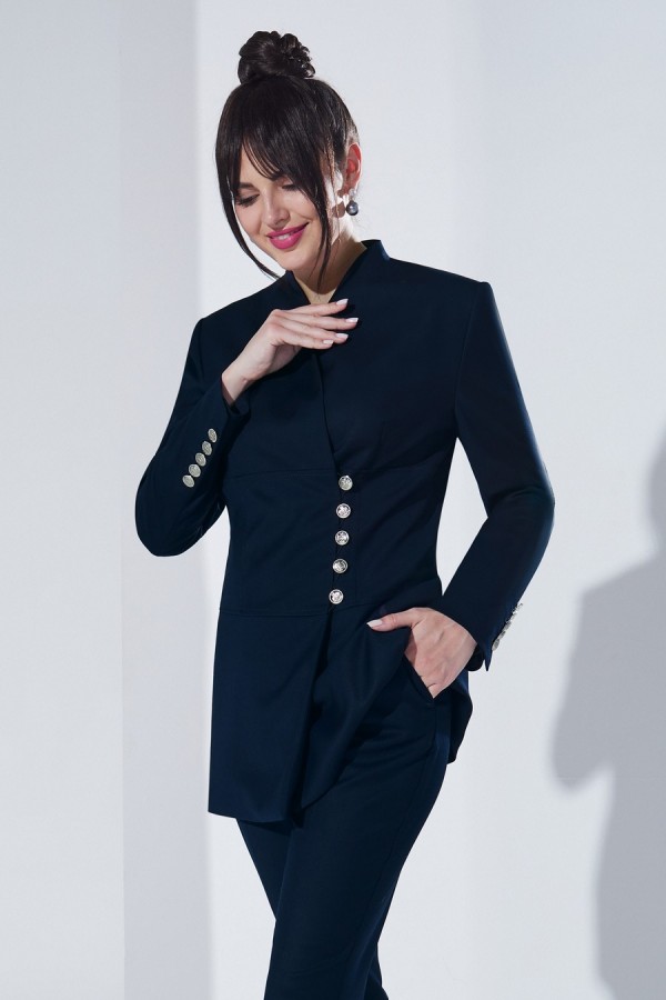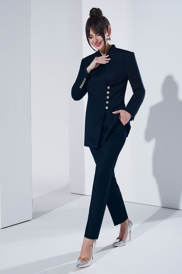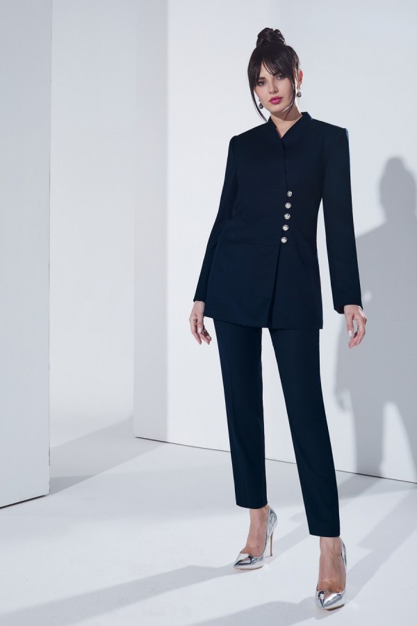 Дизайнерский брючный костюм со смещенной застежкой отличный выбор для ценителей минимализма и строгого стиля. Универсальный комплект впишется в любой гардероб и подойдет на все случаи жизни, подходит для шпилек и обуви на плоском ходу. Вещи из этой ми капсулы легко сочетать с другими вещами, базовые черные брюки отлично будут смотреться с белой рубашкой, а удлиненный жакет можно носить как легкий плащ с платьем или юбкой. Удлиненный жакет с цельнокроеной стойкой и смещенной застежкой, застегивается на воздушные навесные петли. Перед и спинка с подрезами ниже груди и талии оформлены декоративными отстрочками. Рукав втачной с отлетной шлицей. Базовые брюки с косыми карманами заужены к низу. Застежка обработана по классической технологии (гульфик с молнией и пуговица на поясе). Вся обработка выполнена как в классических итальянских костюмах. Жакет на подкладке. На обтачке спинки жакета выполнена аккуратная вышивка.