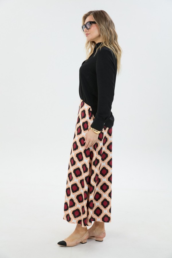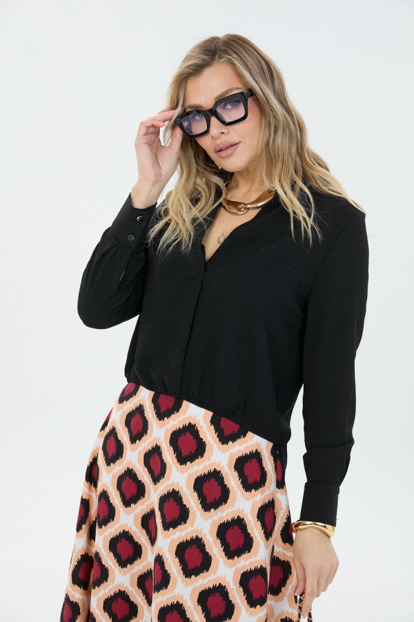 Комплект 2ка, состоящий из блузки и юбки. Блузка свободного силуэта с ассиметричным низом - спереди короче, сзади длиннее. Вырез горловины V-образный, воротник рубашечного типа. По низу переда блузки вставлена резинка. Манжеты с застёжкой на две пуговицы. Юбка кроя трапеция, длины "макси". Пояс юбки по спинке на резинке, сбоку застёжка на потайную молнию и пуговицу.