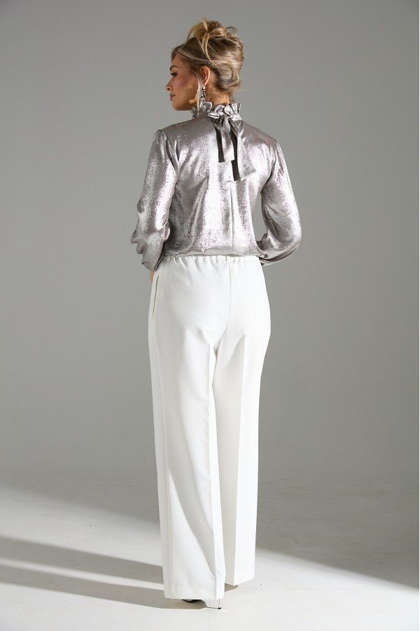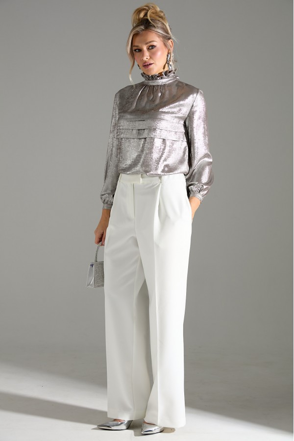 Элегантная блуза из легкой ткани свободного силуэта. По переду блузки добавлен оригинальный элемент в виде складок.Отделка горловины рюшами и красивым бантом по спинке делает блузку отличным вариантом для нарядного и романтичного образа! Рукава блузки объёмные, на манжетах выполнена застежка на пуговицу.