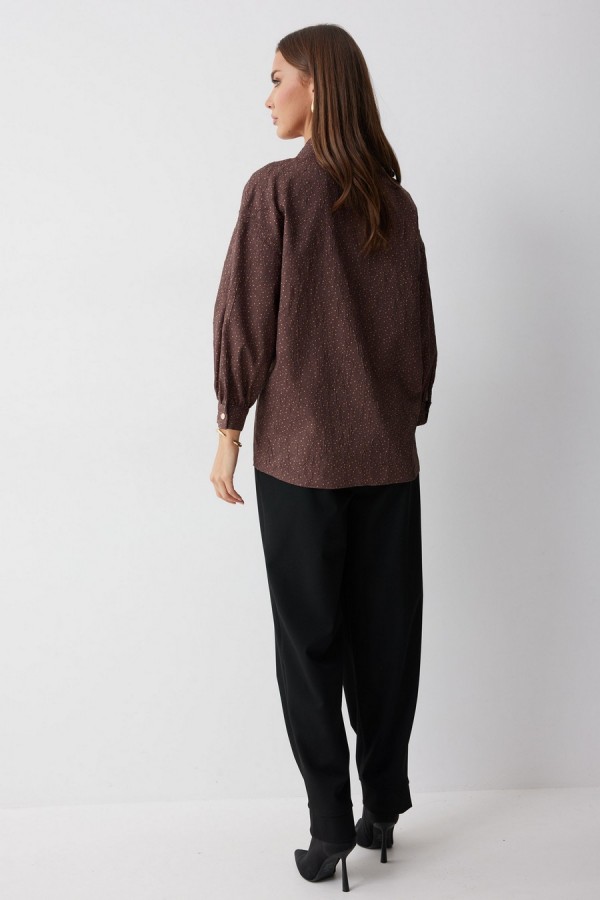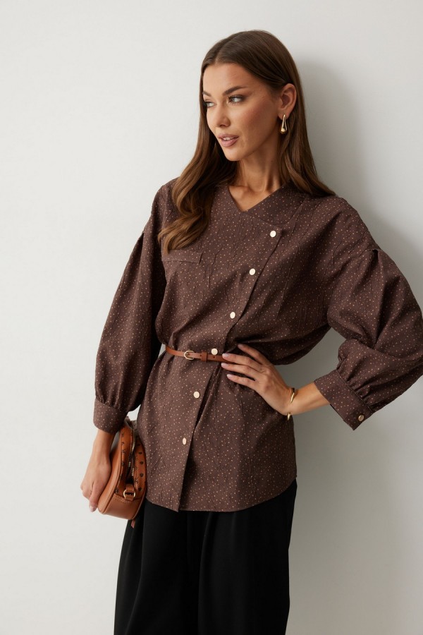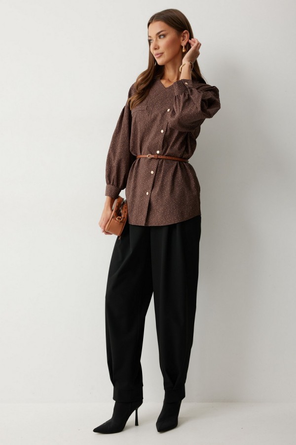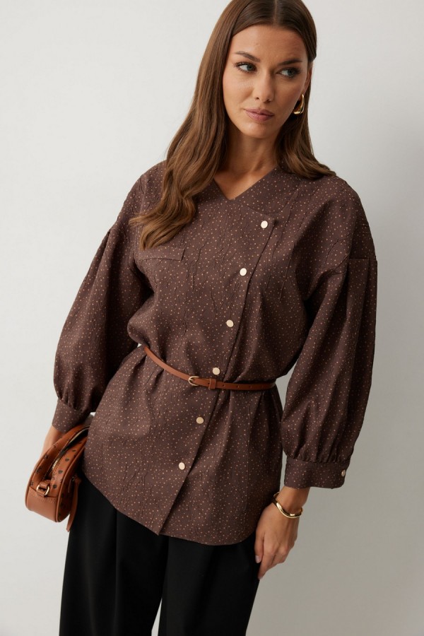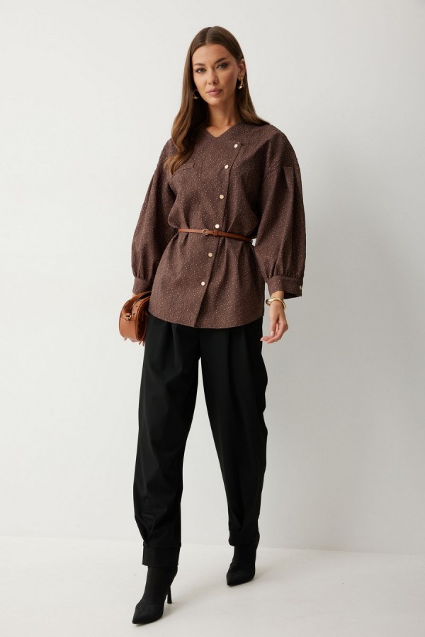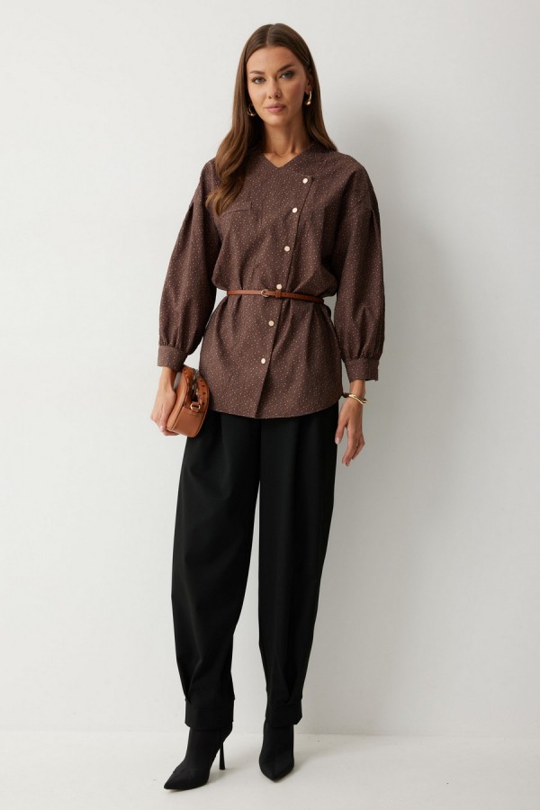 Ассиметричная блузка прямого силуэта. Низ фигурный. Рукав, спущенный с встречной складкой по центру. По низу манжета с застежкой на кнопку. По переду декоративная настрочная листочка. Ассиметричная двубортная застежка на кнопки. Воротник-стойка. Обращаем ваше внимание, что фурнитура может незначительно отличаться от фото. Длина блузки (44-48р - 69см)(50-54р - 71см) Длина рукава от горловины (44-48р - 60,5см)(50-54р - 62см)