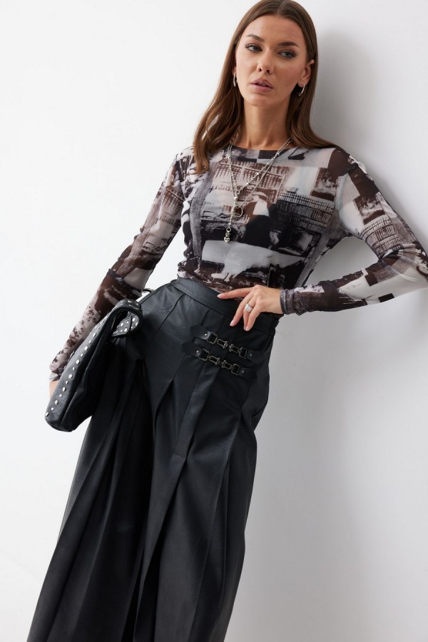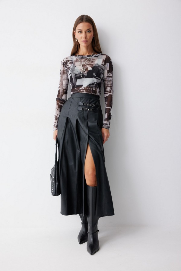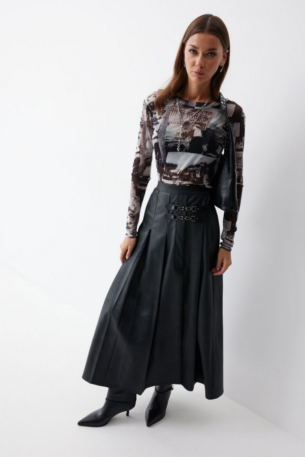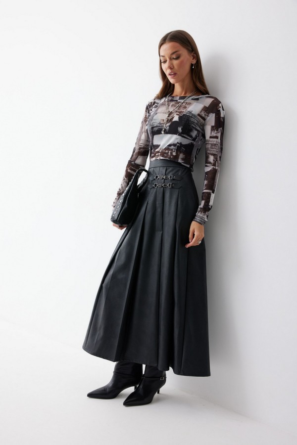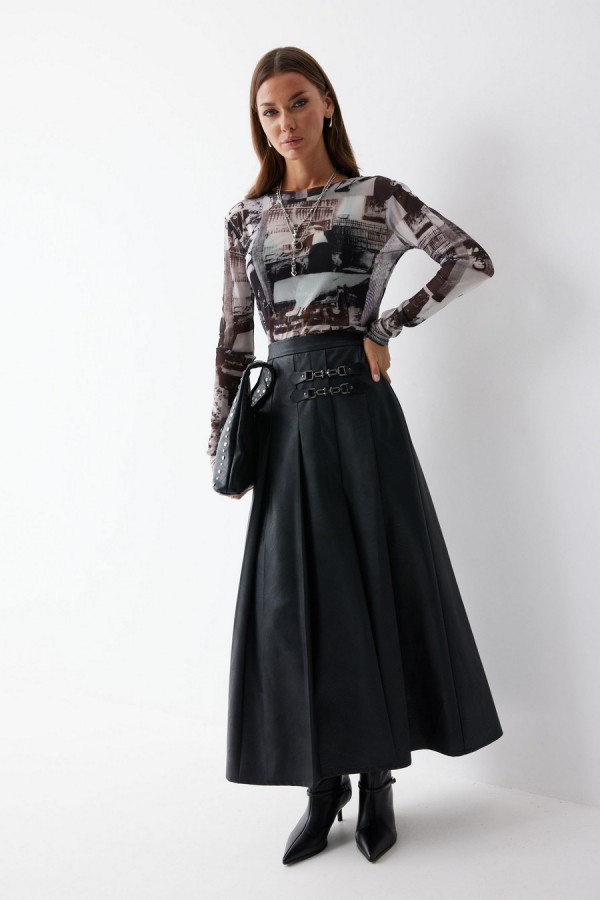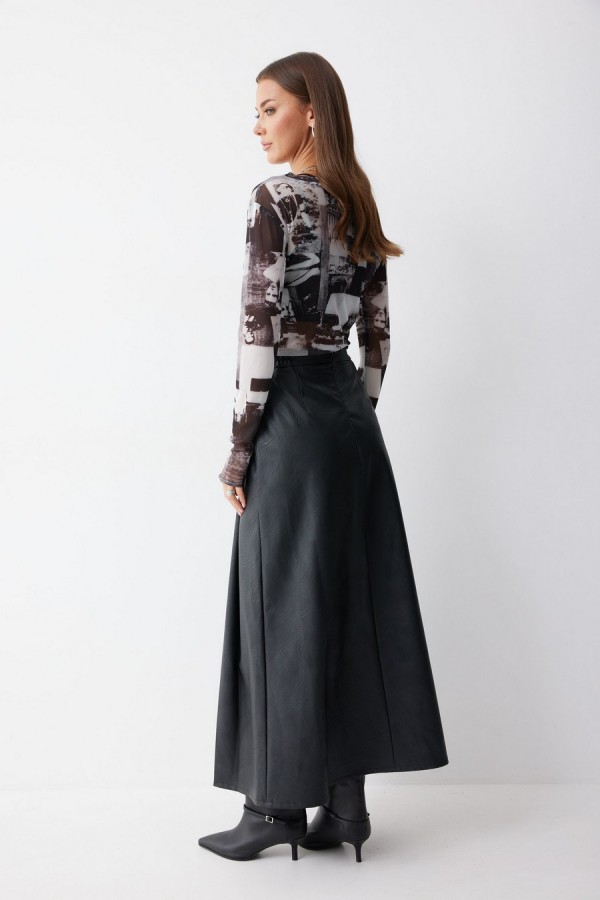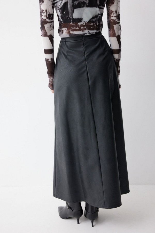 Юбка А-силуэта из экокожи на хлопковой основе длины макси. По верху юбки притачной пояс со шлевками для ремня. Переднее полотнище юбки со складками и шлицей и декоративной фурнитурой. На задних половинках расположены талиевые вытачки. На спинке в центральном шве потайная молния. По бокам в поясе вставлена резинка от складки до вытачки.Длина юбки (94+3,5см пояс)