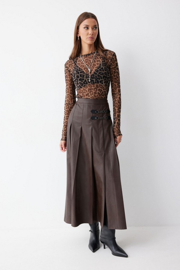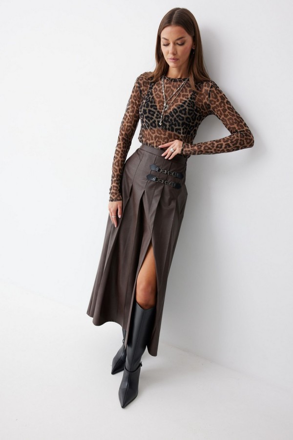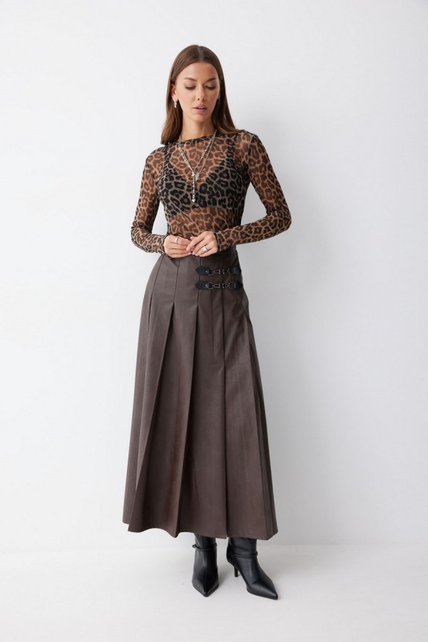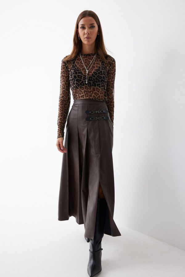 Юбка А-силуэта из экокожи на хлопковой основе длины макси. По верху юбки притачной пояс со шлевками для ремня. Переднее полотнище юбки со складками и шлицей и декоративной фурнитурой. На задних половинках расположены талиевые вытачки. На спинке в центральном шве потайная молния. По бокам в поясе вставлена резинка от складки до вытачки.Длина юбки (94+3,5см пояс)