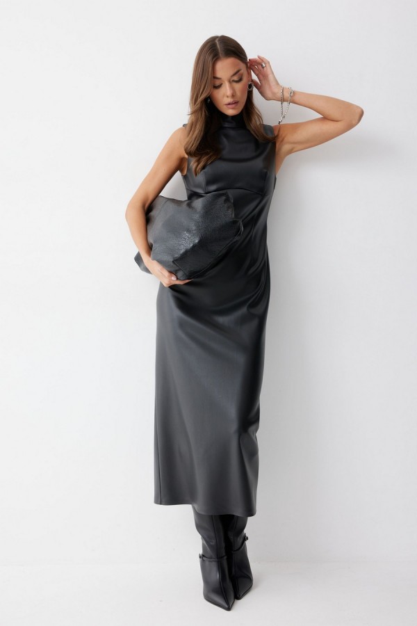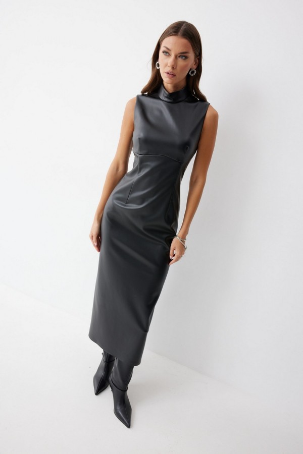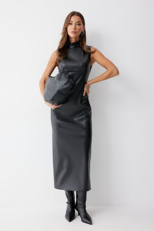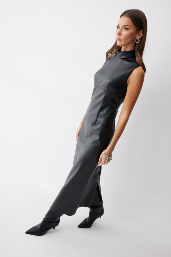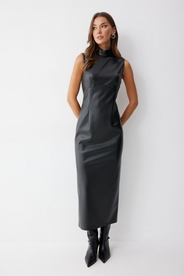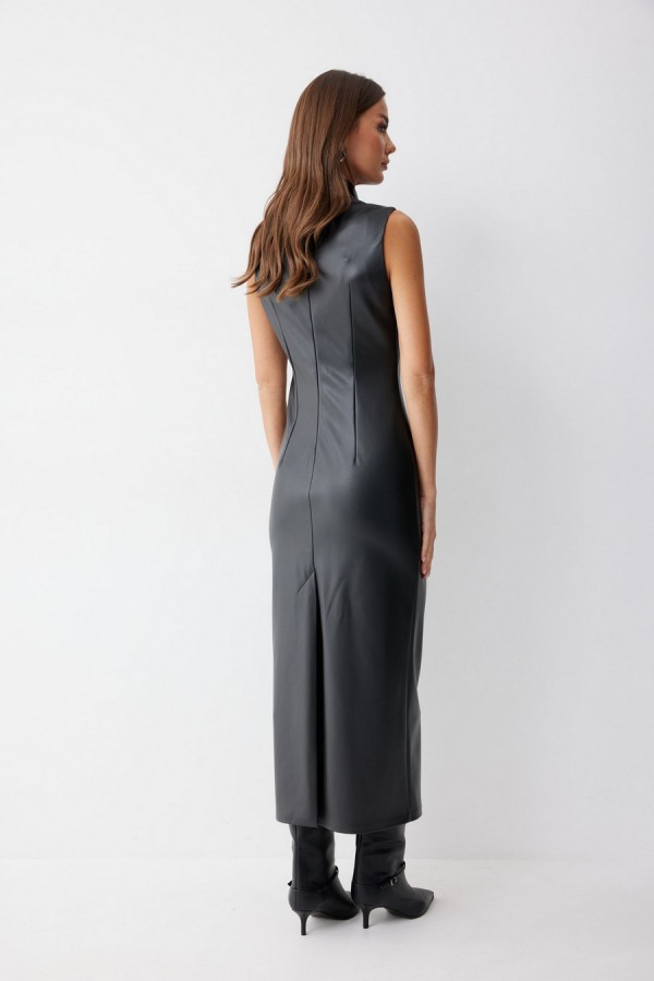 Платье прилегающего силуэта из экокожи длиной миди. Горловина-стойка. Спереди под грудью подрез, нагрудные и талиевые вытачки. На спинке в центральном шве потайная молния, по низу шлица. На спинке платья талиевые вытачки. Длина платья 130см