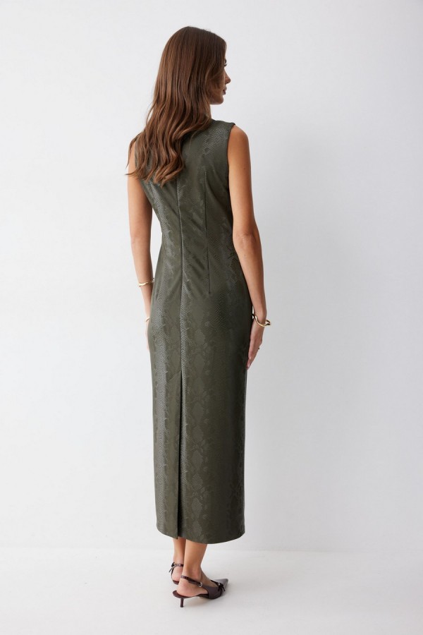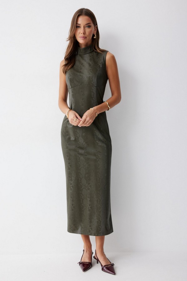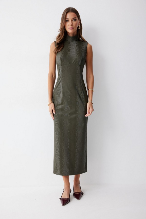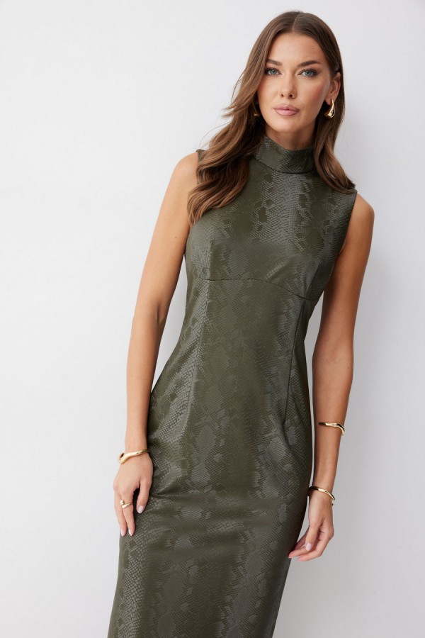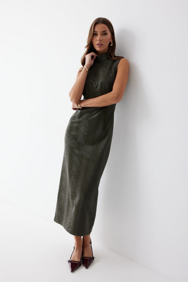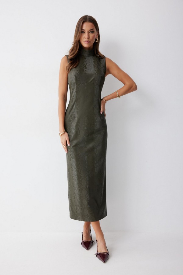 Платье прилегающего силуэта из экокожи длиной миди. Горловина-стойка. Спереди под грудью подрез, нагрудные и талиевые вытачки. На спинке в центральном шве потайная молния, по низу шлица. На спинке платья талиевые вытачки. Длина платья 130см