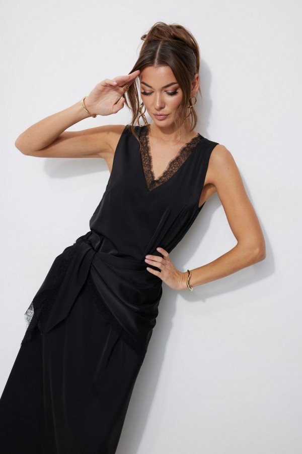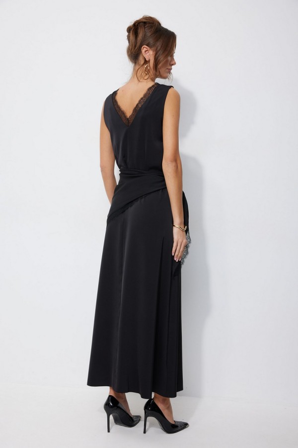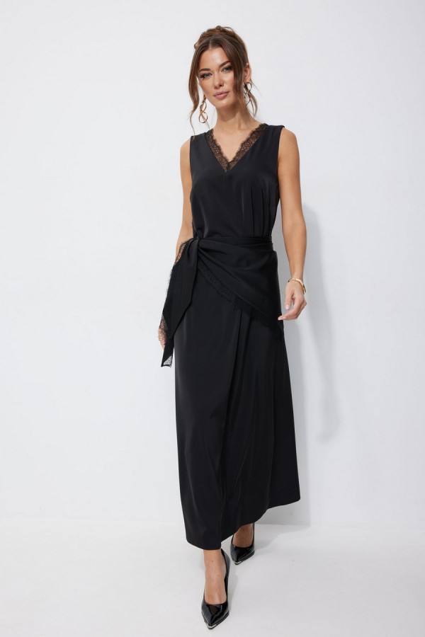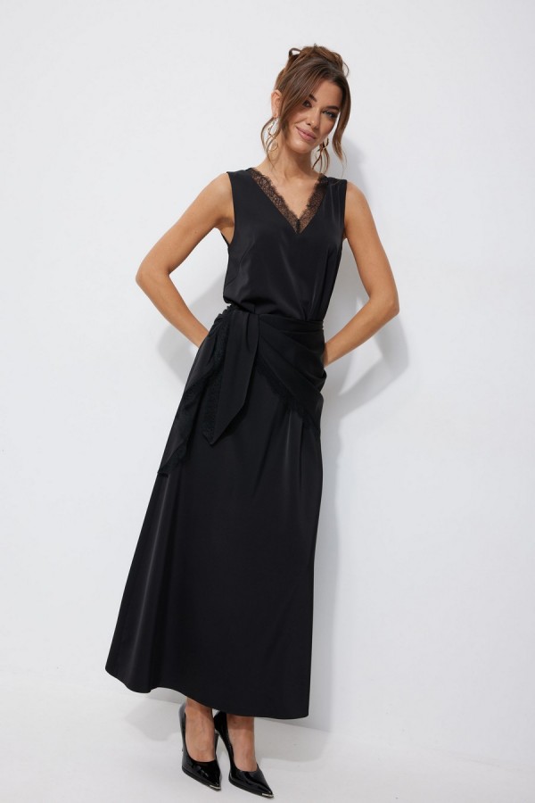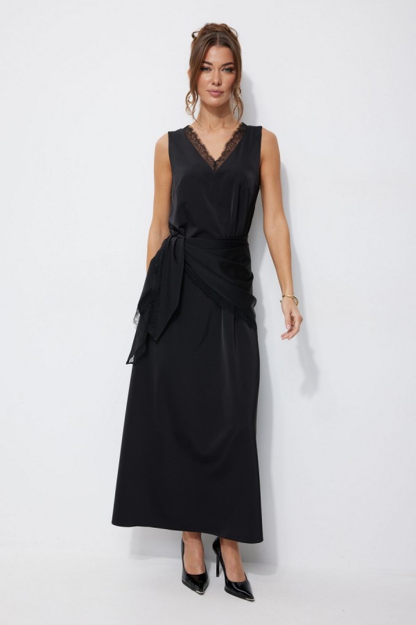 Нарядное платье из струящейся ткани, длина макси. Платье свободного кроя, прямое, расширенное к низу. С глубоким V-образным вырезом горловины по переду и спинке, декорированным французским кружевом. По переду нагрудные вытачки. Без рукава. Платье дополняется платком из основной ткани. Платок декорирован по двум срезам французским кружевом. Обращаем Ваше внимание, что кружево может незначительно отличаться от фото. Длина платья от плеча 139 см во всех размерах.