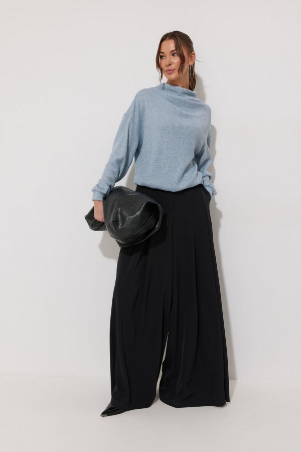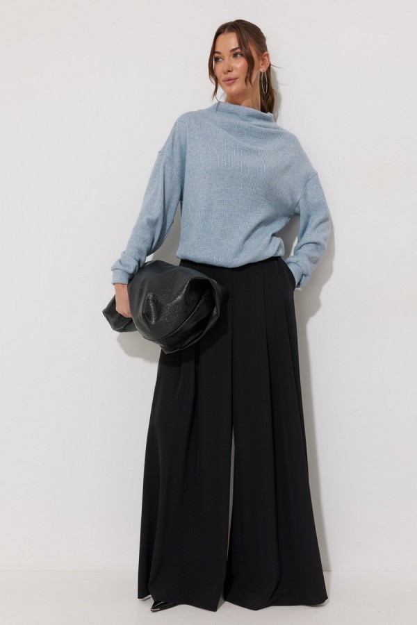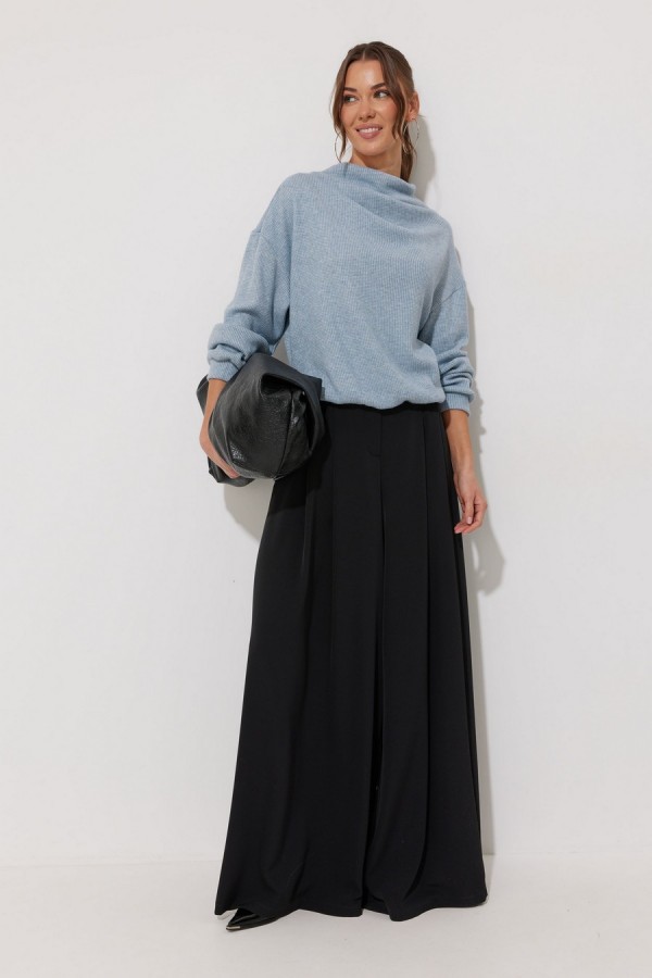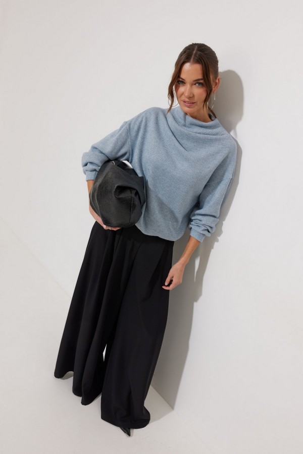 Джемпер из трикотажного полотна , прямого, слегка расширенного силуэта, со спущенной линией плеча. По горловине цельнокроеная стойка. На стойке и плече две складки. Рукав длинный с манжетой с резинкой. По низу джемпера пояс с резинкой.Длина джемпера  (44-48р 61 см) (50-54р 66 см).
