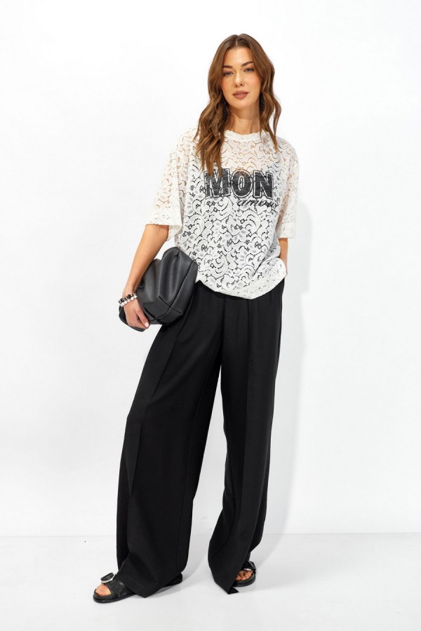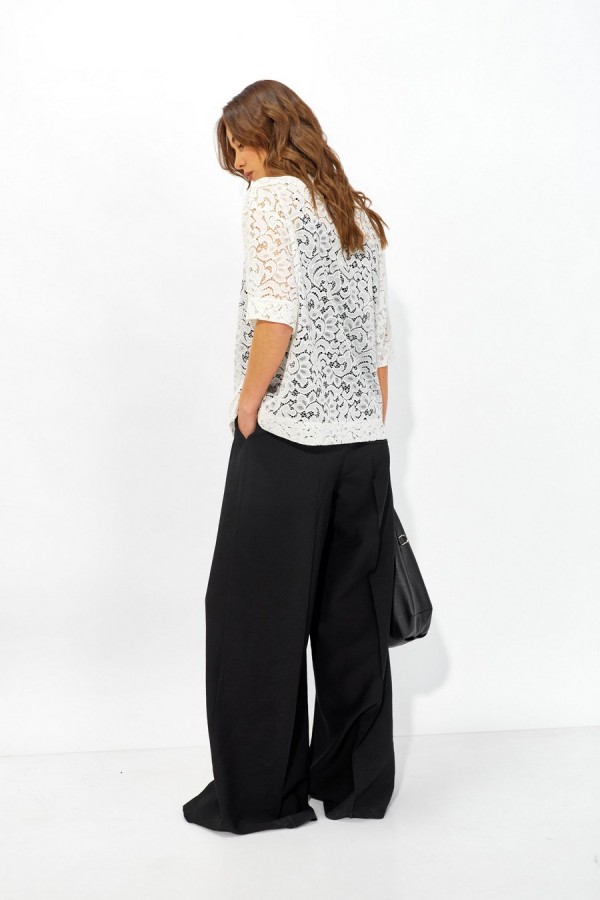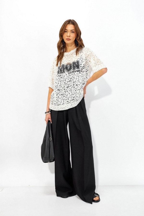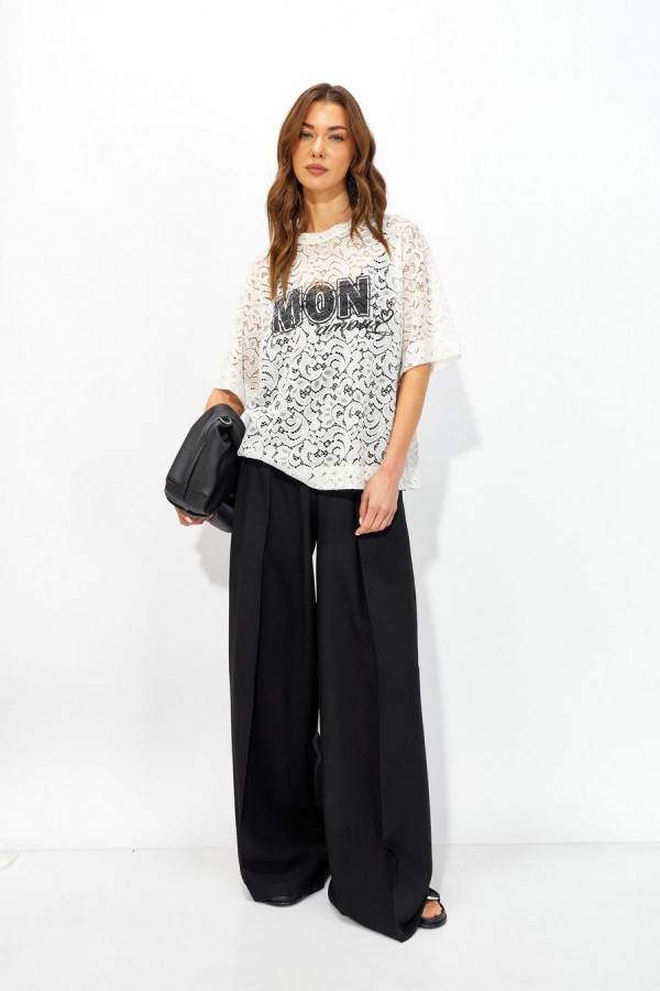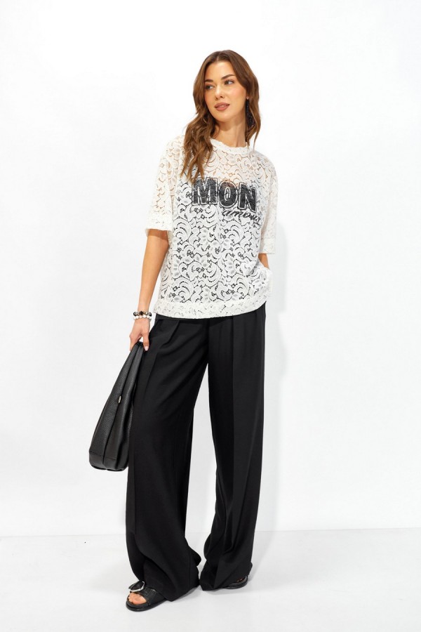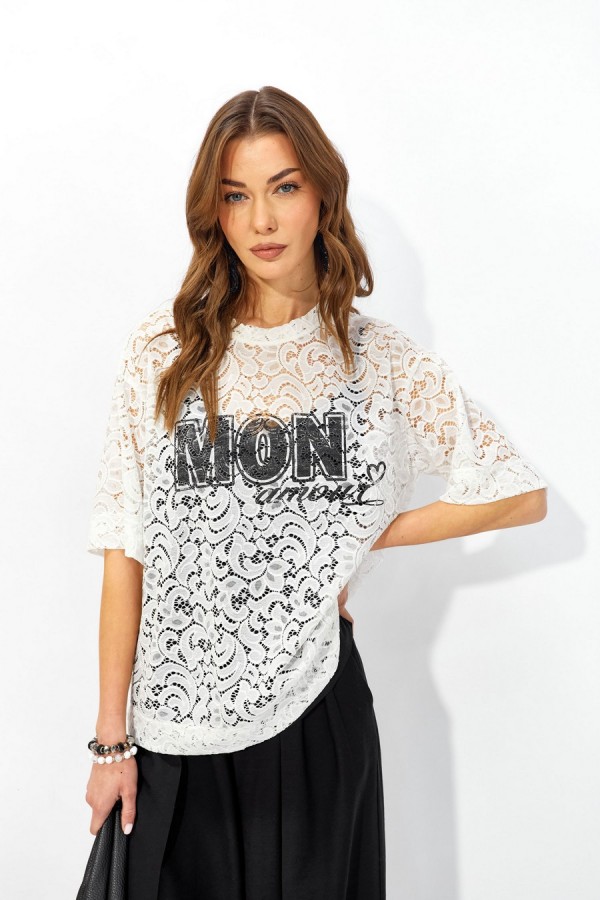 Оригинальный джемпер из эластичного кружева прямого силуэта, вырез горловины округлый, обработан притачной планкой. По переду выполнена дизайнерская печать контрастного цвета.Длина по спинке 44-48 – 61см, 50-54 –63 см, 56-62 -65 см. Длина рукава от горловины - 44-48 -42см, 50-54 – 44см, 56-62 – 46см.