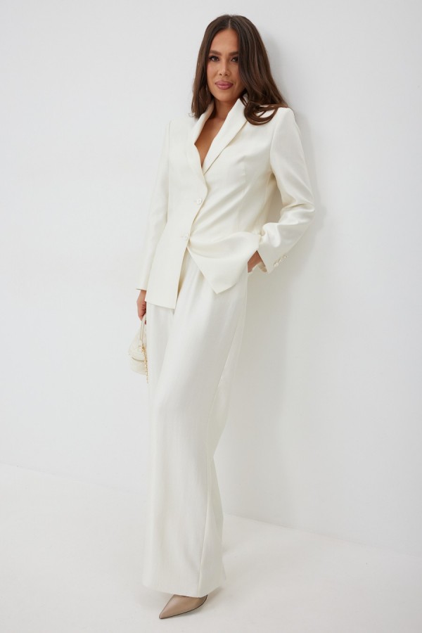 Элегантный и безумно красивый костюм из жакета и брюк. Выполнен из красивой гладкой костюмной ткани с легким жемчужным отблеском. Жакет прямого свободного кроя с красивыми рельефами, на подкладке, с центральной застежкой на пуговицы. Брюки классического прямого кроя с притачным поясом, дополненным эластичной тесьмой. Дополнены удобными боковыми и задними карманами. Застежка гульфик на молнию и пришивную пуговицу. Длина жакета от плечевого шва 73 см. Длина рукава 60см. Длина брюк 107 см