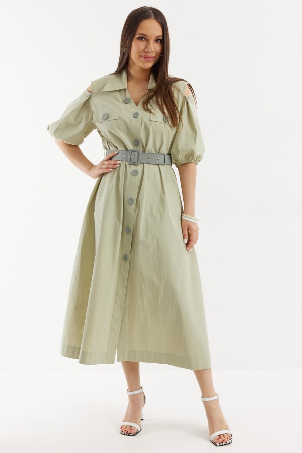 Легкое и воздушное платье из натуральной хлопковой ткани средней плотности с легким эффектом жатки, которая не просвечивает и прекрасно держит форму. Платье А-образного силуэта с центральной застежкой на пришивные пуговицы. Дополнено съемным ремнем с пряжкой. Горловина обработана отложным воротником. Объемный рукав присборен на эластичную тесьму. Дополнен красивыми вырезами. Удобные карманы расположены в боковых швах. Длина платья от плечевого шва125см. Длина рукава 36см.