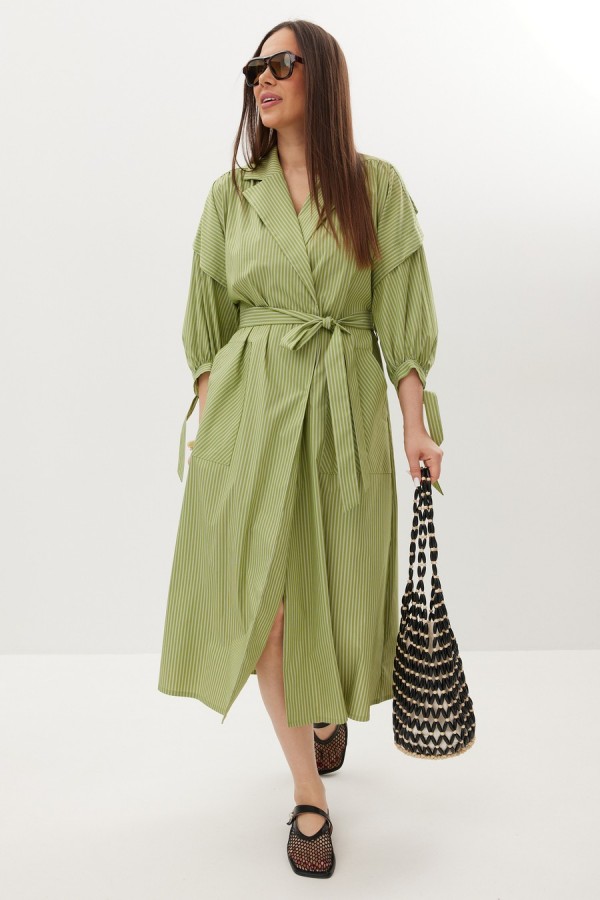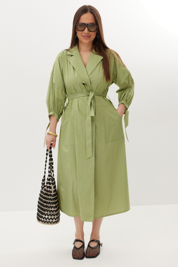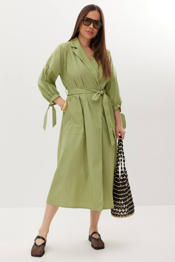 Легкое платье в полоску из натуральной хлопковой ткани. Платье двубортное свободного силуэта с центральной застежкой на кнопки. Приталено за счет съемного пояса, выполненного из основной ткани. Горловина обработана отложным воротником. Рукав со спущенной линией плеча. Низ рукава дополнен притачной манжетой с завязкой. По спинке платья красивая кокетка. Удобные боковые карманы добавляют платью непринужденности. Длина платья от плечевого шва 118см. Длина рукава 42см.