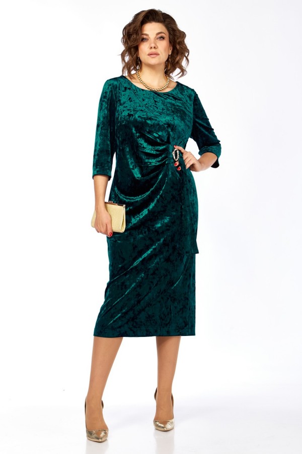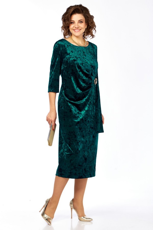 Платье женское, выполнено из бархатного полотна, длиной миди. Спинка со средним швом, шлицей на движение и потайной тесьмой-молнией. Перед с нагрудными вытачками из боковых швов, округлым вырезом горловины, и подрезом от правого плеча. Правая деталь переда присобирается в драпировку в области талии и закреплена декоративной пряжкой. Рукав втачной одношовный, длиной 3/4.