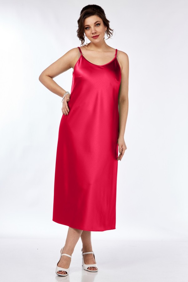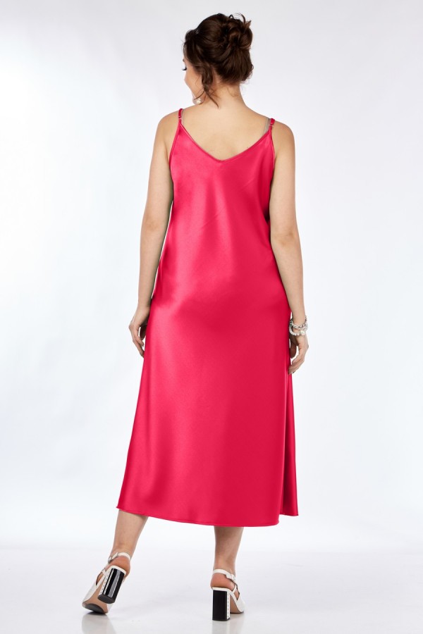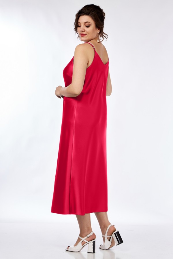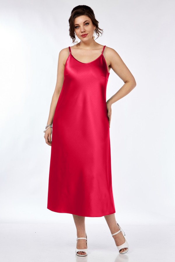 Платье полуприлегающего силуэта, из плотной атласной ткани. Длина миди, с нагрудными вытачками из боковых швов и с округлым вырезом горловины по переду и спинке, на тонких регулирующихся бретелях.