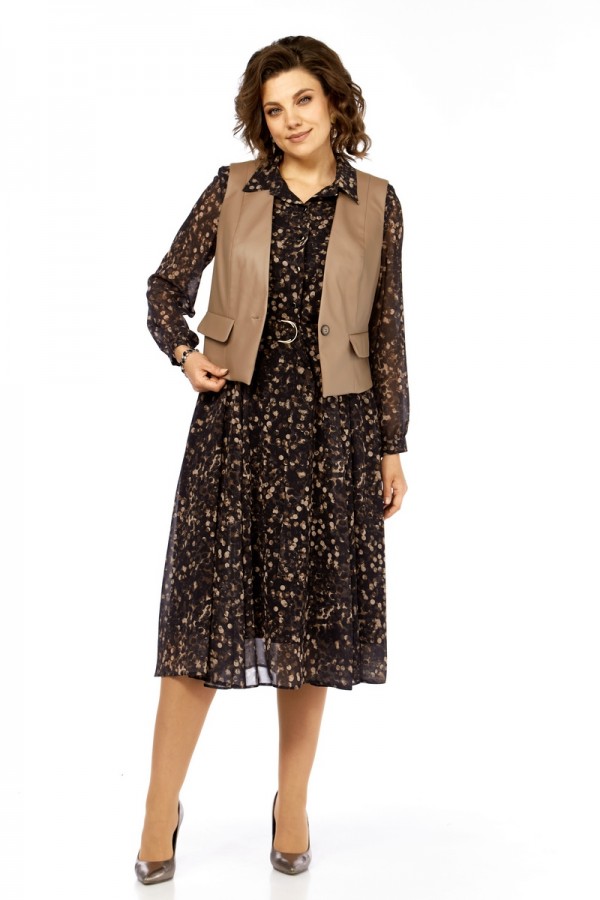 Длина платья по спинке - 120 см, длина рукава - 62 см. Длина жилета по спинке - 49 см Комплект женский, состоящий из платья и жилета. Платье свободного силуэта, шифоновое, полностью на подкладке. Рукав втачной, снизу собран на манжету, манжета застегивается на петлю и пуговицу. По талии платье отрезное, спереди до талии планка на петли и пуговицы и нагрудные вытачки, которые позволяют создать идеальную посадку по груди. Юбка-шестиклинка. Дополнительно в комплекте к платью присутствует пояс из основной ткани. Жилет полуприлегающего силуэта из эко-кожи, с накладными декоративными клапанами, застежка на одну петлю и пуговицу.