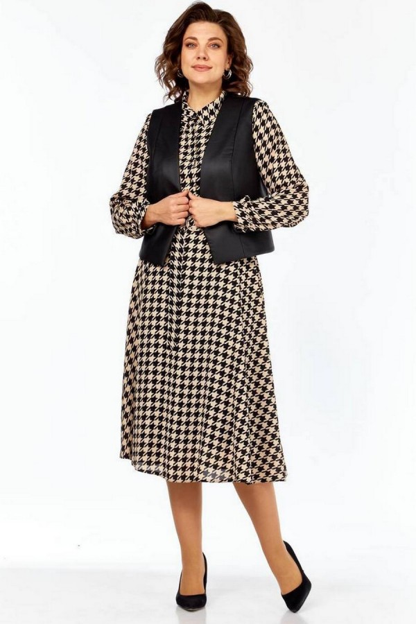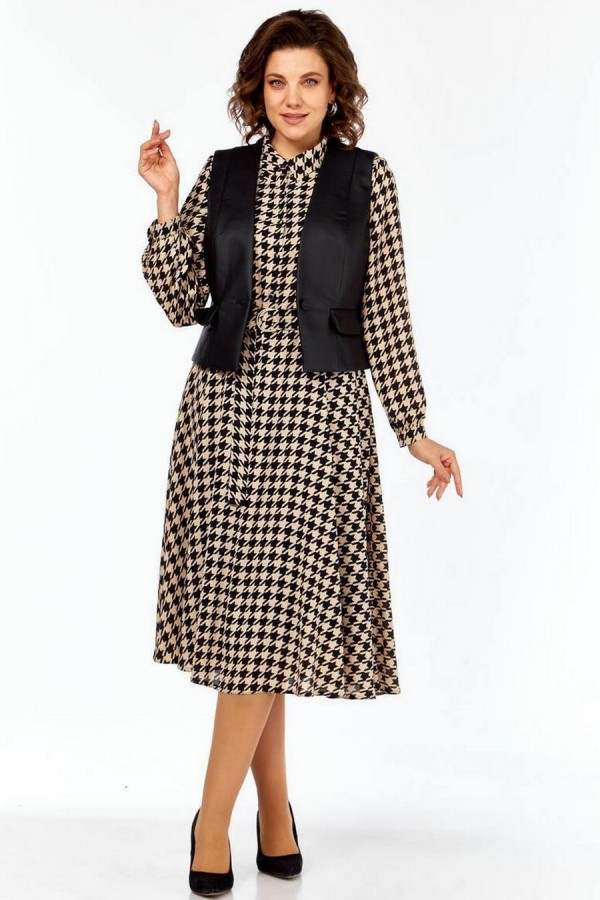 Длина платья по спинке - 120 см, длина рукава - 62 см. Длина жилета по спинке - 49 см Комплект женский, состоящий из платья и жилета. Платье свободного силуэта, шифоновое, полностью на подкладке. Рукав втачной, снизу собран на манжету, манжета застегивается на петлю и пуговицу. По талии платье отрезное, спереди до талии планка на петли и пуговицы и нагрудные вытачки, которые позволяют создать идеальную посадку по груди. Юбка-шестиклинка. Дополнительно в комплекте к платью присутствует пояс из основной ткани. Жилет полуприлегающего силуэта из эко-кожи, с накладными декоративными клапанами, застежка на одну петлю и пуговицу.