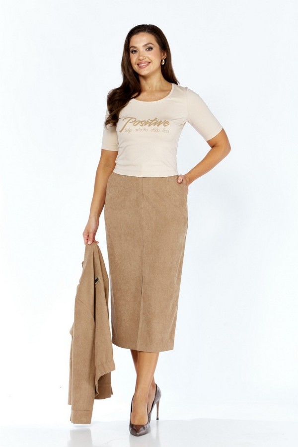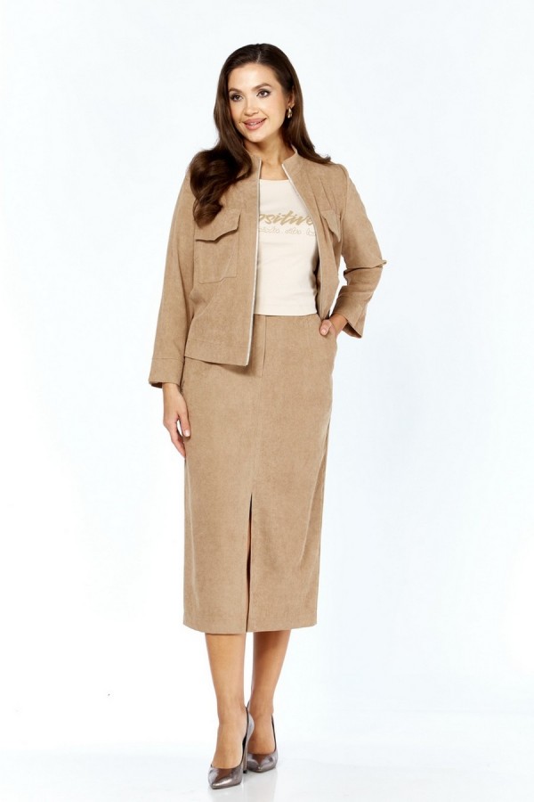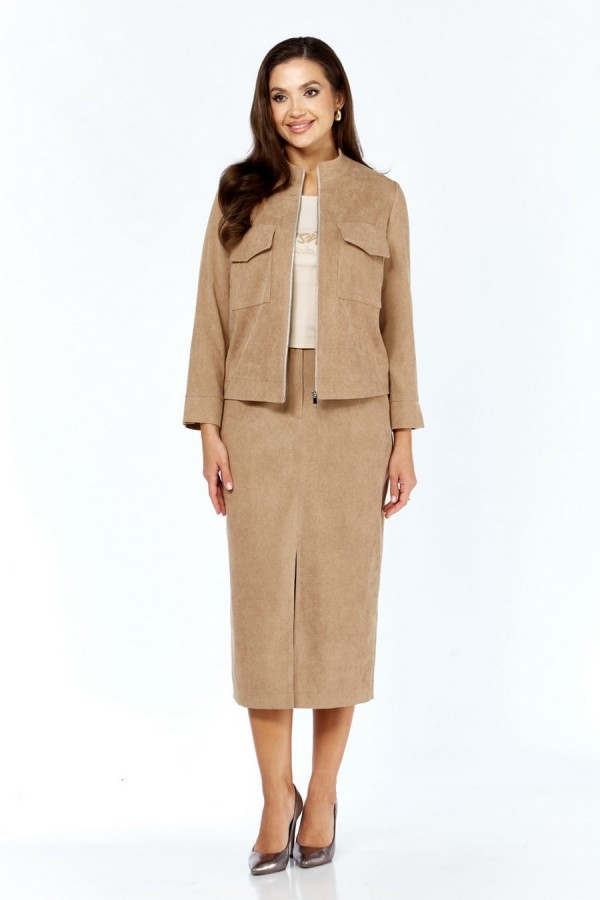 Жакет: длина по спинке – 55 см, длина рукава – 56 см. Юбка: длина по боковому шву - 87 см. Кроп-топ: длина по спинке – 45 см, длина рукава – 28 см. Костюм женский состоящий из жакета в спортивном стиле, юбки-карандаш и кроп-топа. Жакет без подкладки, с воротником-стойкой, застегивается на молнию до верха, со втачным рукавом длины 3/4, низ рукава заканчивается манжетой с разрезом. По переду куртки накладные карманы с клапаном. По спинке отрезная кокетка, низ спинки присборен на резинку. Юбка-карандаш без подклада, заужена книзу, имеет разрез по переду для удобства. Пояс юбки присборен на резинку для лучшего прилегания сзади, спереди застегивается на молнию и петлю и пуговицу. На передних половинках обработаны карманы-хулиганы, на задних – накладные карманы. Кроп-топ с коротким втачным рукавом, округлая горловина обработана бейкой, по переду нанесена печать. Костюм можно как носить готовым комплектом, так и сочетать с вещами из вашего гардероба.