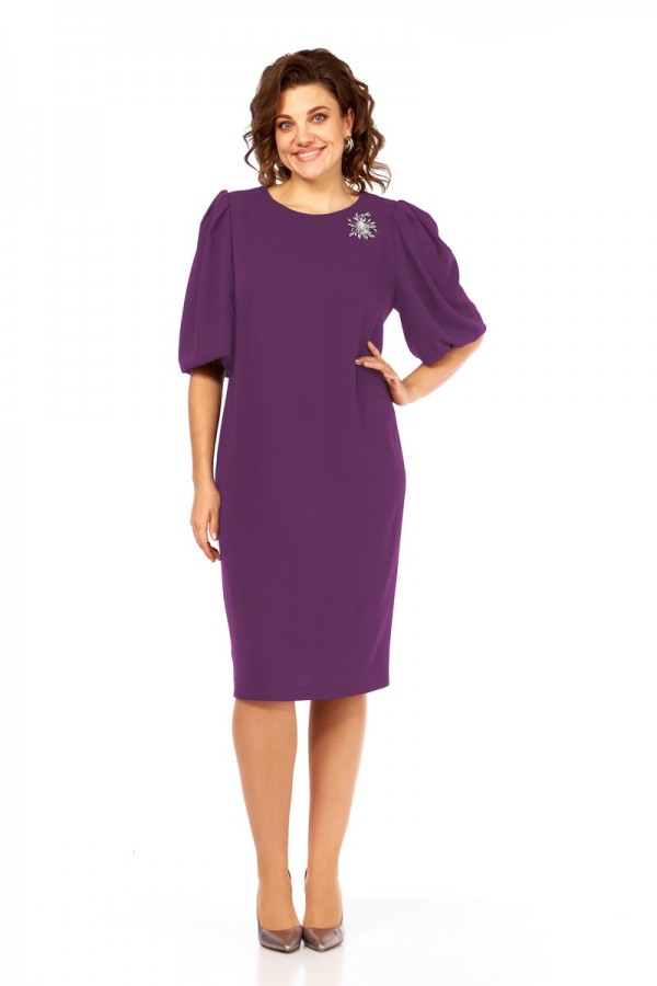 Длина плечевого шва - 9 см, длина рукава - 40 см, длина изделия по спинке - 103 см. Платье-футляр, полуприлегающего силуэта, длины миди, без подкладки. Рукава – «фонарики», горловина круглая. Объемное украшение (брошь) пристегивается. По спинке шов, в котором обработана застежка-молния и шлица для удобства при ходьбе. Модель подойдет для легкого праздничного или вечернего образа.