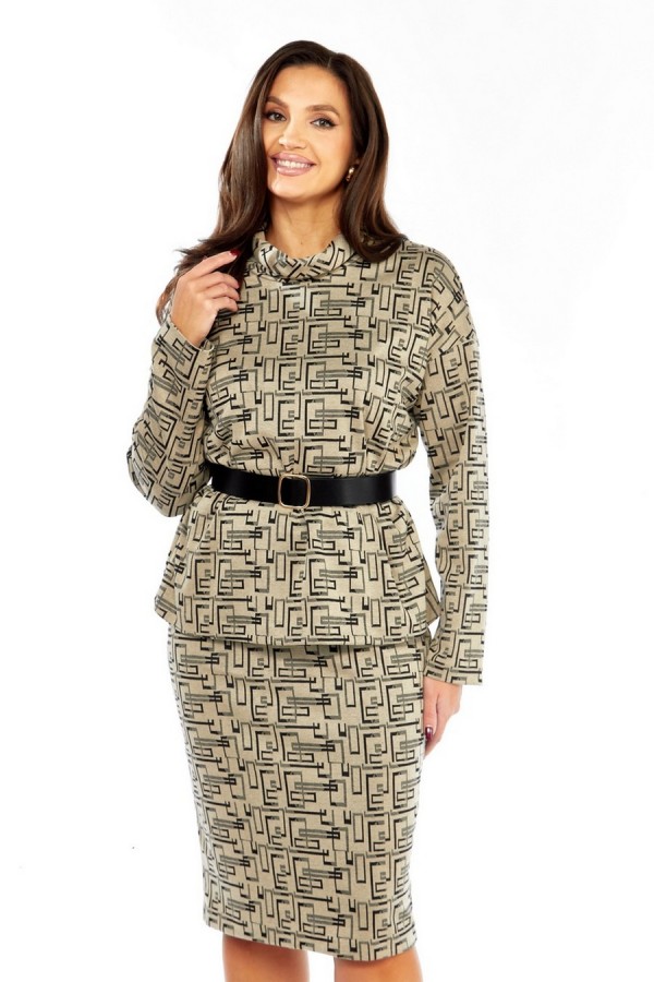 Длина по спинке - 68 см, длина рукава от горловины - 71 см. Длина юбки - 65 см Костюм женский, состоящий из джемпера и юбки. Джемпер свободного силуэта, со спущенным рукавом. Воротник-"хомут". Юбка прямая, по талии на резинке, без застежки. В комплекте-ремень.