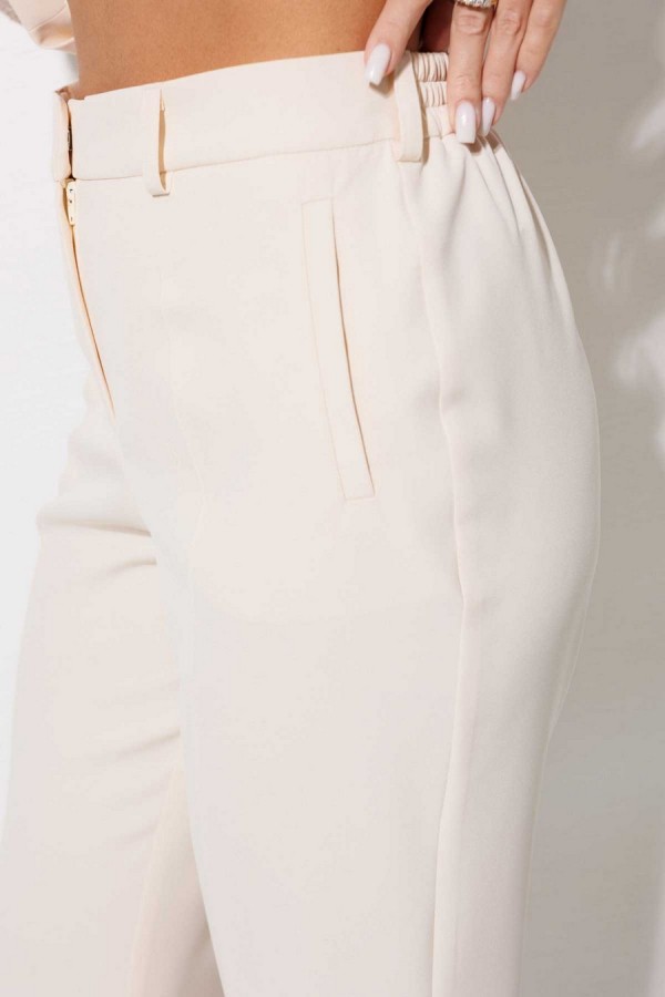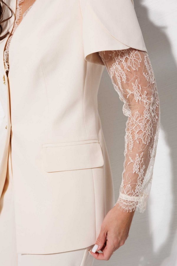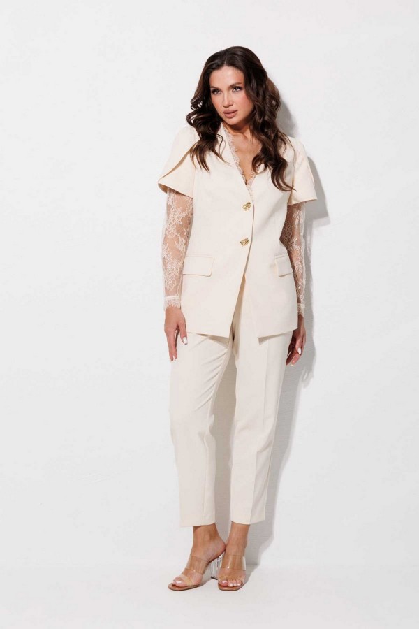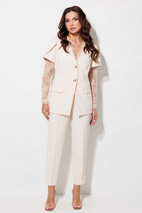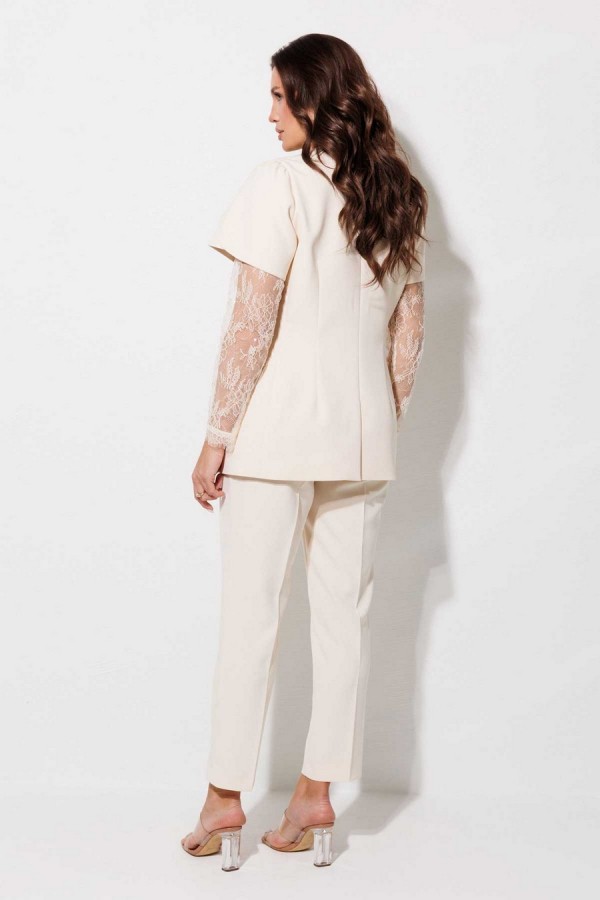Костюм женский, состоит из жакети и брюк. Жакет полуприлегающего силуэта, с центральной бортовой застежкой на 2 петли-пуговицы. Перед с нагрудными вытачками и карманами в рамку с клапанами. Спинка с талиевыми вытачками, со средним швом, заканчивающимся шлицей. Рукав - двойной из основной и кружевной ткани. Горловина обработана декоративным кружевом. Жакет на подкладке. Брюки женские с высокой посадкой на широком поясе зауженные к низу. По переду прорезные карманы с листочкой, и застёжка молния с гульфиком и откоском. Пояс по спинке на резинке и застёгивается на прорезную петлю и пуговицу.