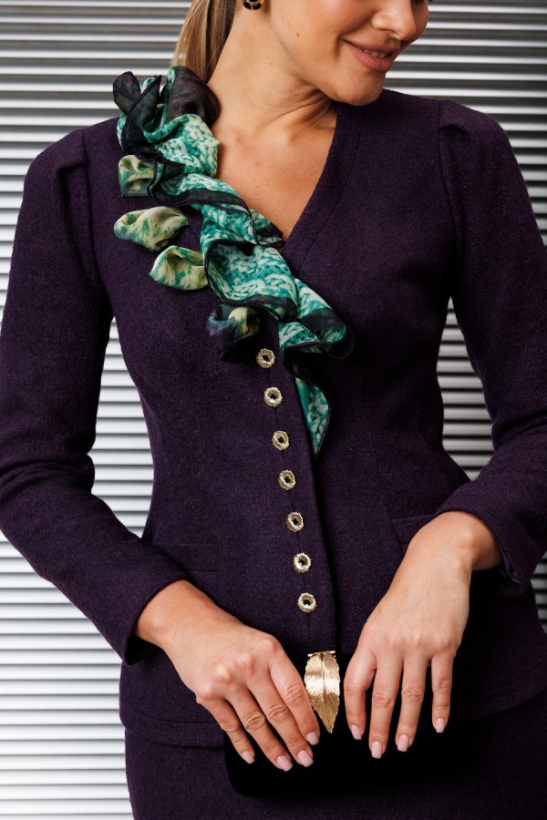 длина жакета: 65 см длина рукава: 62 см длина юбки: 70 см рост: 164 см Материал: жакет, юбка: шерсть 47% модакрил 35% ПЭ 18% ОПИСАНИЕ ТЕХНИЧЕСКОЕ: Что делает образ женственным и романтичным? Конечно же силуэты, подчеркивающие женскую фигуру, а также такие ткани как органза, шелк, шифон. Дизайнеры бренда "МОДА-ЮРС" предлагают Вам новинку - жакет из шерсти со съемным шарфом . Данная модель смотрится очень стильно и женственно. Такой жакет может стать основой многих образов. Смело сочетайте его со своими праздничными и деловыми блузами. Жакет полуприлегающего силуэта. По переду и спинке с талиевыми вытачками, на полочках обработаны карманы. Спинка со средним швом. Рукава втачные, двухшовные, сверху по окату со складками. Застежка центральная на петли-пуговицы. Жакет декорирован съемным шарфом, нижняя часть которого застегивается на петли-пуговицы. Юбка прямая, зауженная к низу, сверху на притачном поясе, по бокам с резинками. Застежка на тесьму-молнию в среднем шве, который переходит в шлицу