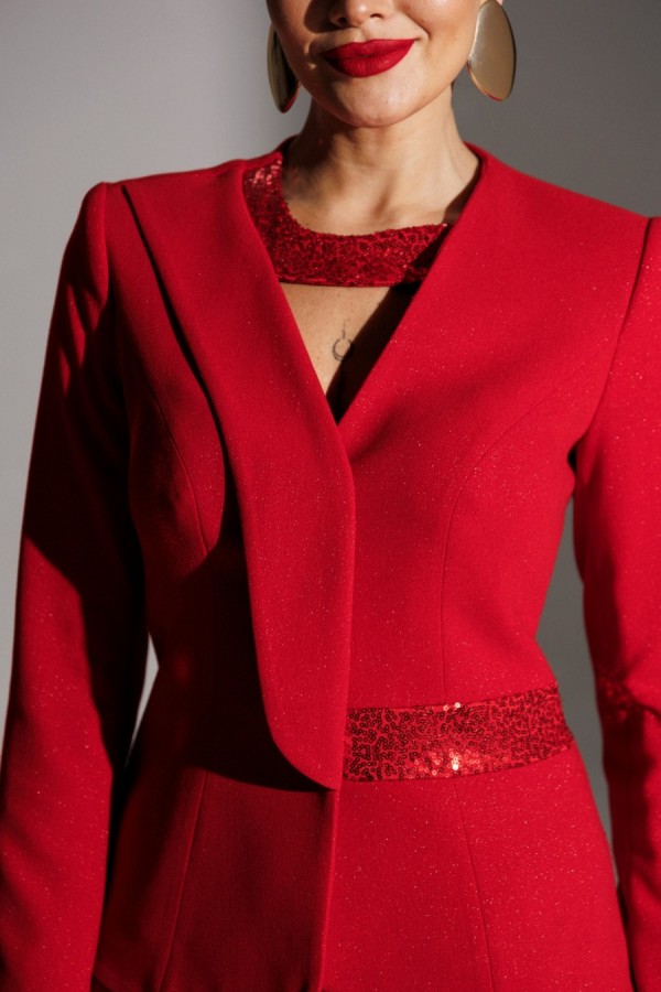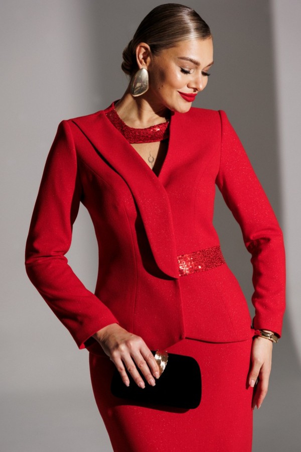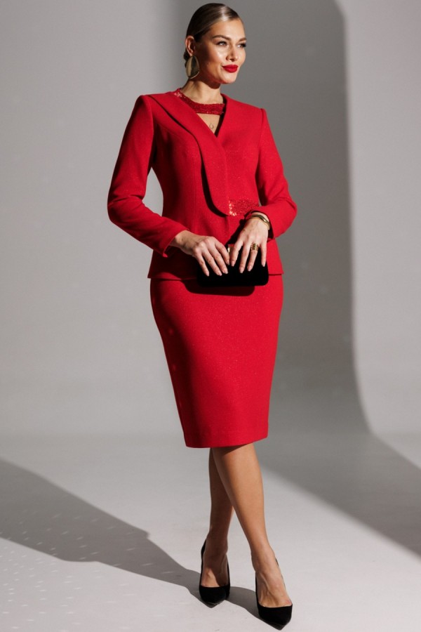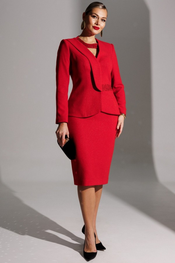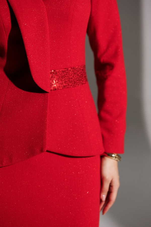 длина спинки жакета: 64,5 см длина рукава: 61 см длина юбки по боковому шву: 69,5 см рост: 164 см Материал: жакет, юбка : ПЭ 65%, вискоза 33%, спандекс 2% ОПИСАНИЕ ТЕХНИЧЕСКОЕ: Женственность в каждом шве! Мы предлагаем Вам новинку от бренда "МОДА-ЮРС", которая выделит Ваши лучшие стороны: акцент на талию, плавные линии, идеальная посадка. Забудьте о массивных плечах и прямых линиях - теперь это нежные линии, которые подчеркивают Вашу фигуру и добавляют образу утонченности. Жакет полуприлегающего силуэта с рельефами по переду и спинке. Рукава втачные, двухшовные. Спинка со средним швом. Жакет декорирован отрезными деталями по линии талии и горловине, которые выполнены из ткани в пайетки. Главным акцентом является отрезной лацкан с одной стороны и брошь, декорированная жемчужинами, с другой стороны. Застежка на металлические пришивные кнопки. Юбка прямая, зауженная к низу, сверху на притачном поясе, по бокам с резинками. Застежка на тесьму-молнию в среднем шве. Комплект на подкладке.Таблица измерений изделия в готовом виде