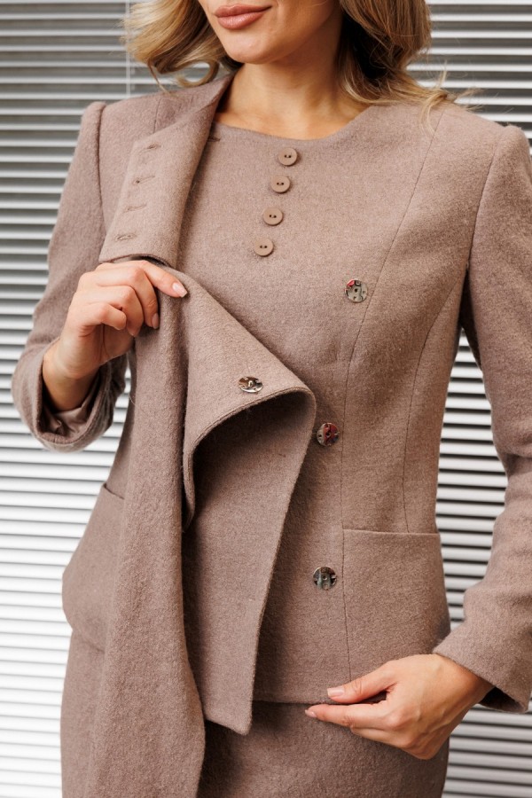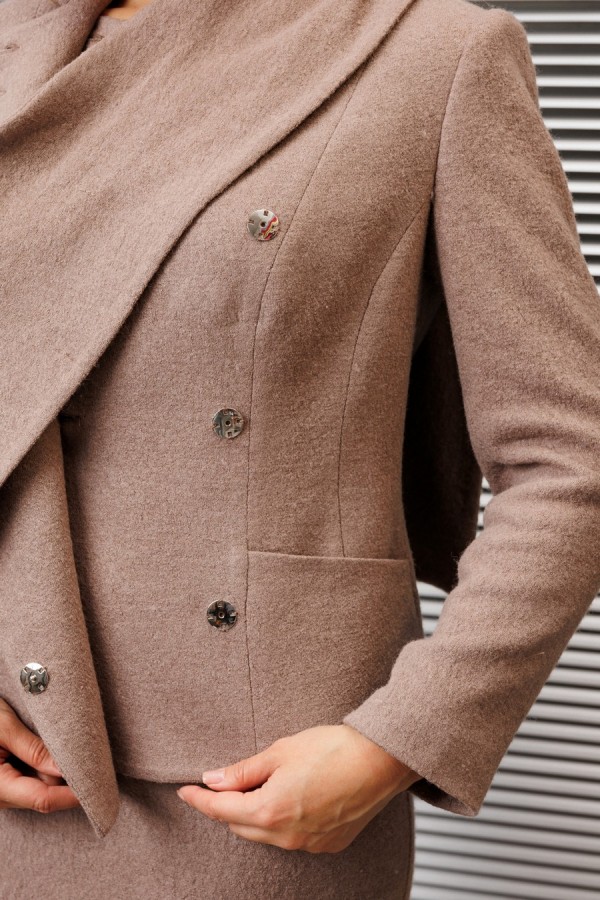 длина жакета: 60 см длина рукава: 61 см длина юбки: 69 см рост: 164 см Материал: жакет, юбка: шерсть 47% модакрил 35% ПЭ 18% ОПИСАНИЕ ТЕХНИЧЕСКОЕ: Комплект женский, состоящий из жакета и юбки. Жакет полуприлегающего силуэта с рельефами по переду и спинке. Полочка с карманами от рельефа до бокового шва. Застежка на кнопки и в верхней части на петли-пуговицы. В жакете оригинально оформлена линия горловины - в виде драпирующегося шарфа, что позволяет использовать его в прохладную погоду в качестве верхней одежды. Юбка прямая, зауженная к низу, сверху на притачном поясе с резинками. Застежка на тесьму-молнию в среднем шве, которая переходит в шлицу. Костюм на подкладкеТаблица измерений изделия в готовом виде