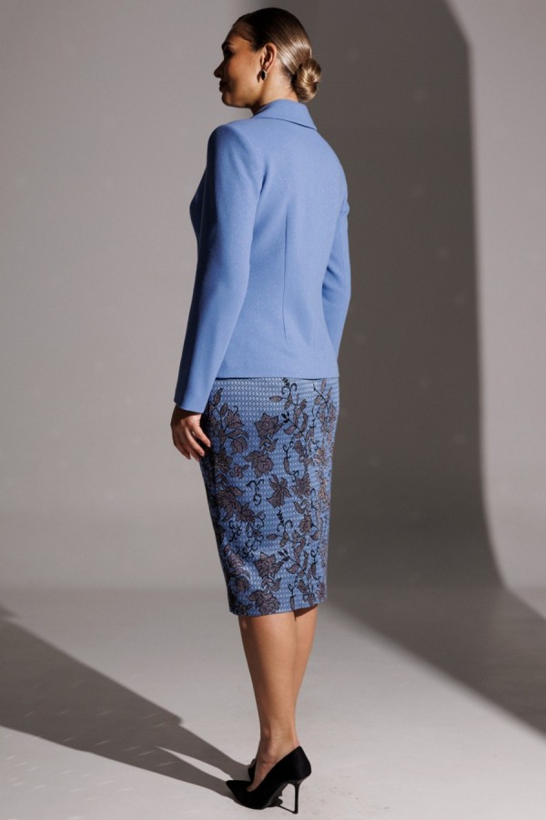 длина спинки жакета: 61 см длина рукава: 62 см длина юбки по боковому шву: 73 см рост: 164 см Материал: жакет,юбка в цвете ГОЛУБОЙ: ПЭ 62%, вискоза 33%, спандекс 3% люрекс 2% в цвете ГОЛУБОЙ_ПРИНТ: жакет ПЭ 62%, вискоза 33%, спандекс 3% люрекс 2% юбка ПЭ 68%, вискоза 18%, эластан 7% люрекс 7% ОПИСАНИЕ ТЕХНИЧЕСКОЕ: Элегантность с характером. Именно так можно описать одну из новинок от брэнда "МОДА-ЮРС". Она идеально впишется в модный гардероб и подчеркнет вашу естественную красоту. Жакет полуприлегающего силуэта с фигурными рельефами, переходящими в карман. В жакете фантазийный воротник с декоративными элементами. Застежка центральная на петли-пуговицы. Рукав втачной, двухшовный. Спинка со средним швом и вытачками. Юбка прямая, зауженная к низу, сверху на притачном поясе. Застежка на тесьму-молнию в среднем шве, который переходит в шлицу. Костюм на подкладкеТаблица измерений изделия в готовом виде