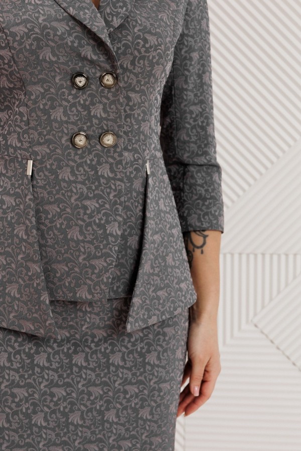 длина спинки жакета: 61,5 см длина рукава: 22 см длина юбки по боковому шву: 67 см (в размерах 46-48) 71 см (в размерах 50-54) рост: 164 см Материал: серый - ПЭ 96%, эластан 3% другие расцветки - ПЭ 96%, спандекс 4% ОПИСАНИЕ ТЕХНИЧЕСКОЕ: Что сделает комплимент Вашей фигуре? Правильный силуэт! Костюм от бренда Мода-Юрс подчеркнет все изгибы и достоинства Вашей фигуры. Жакет полуприлегающего силуэта с отрезной баской фигурной формы и воротником "шалька". Перед с рельефами, выходящими из проймы. Спинка со средним швом. Рукав втачной, одношовный. Юбка прямая, зауженная к низу, сзади со средним швом, переходящим в шлицу. Застежка на тесьму-молнию. Пояс притачной, по бокам с резинками. Жакет и юбка на подкладкеТаблица измерений изделия в готовом виде