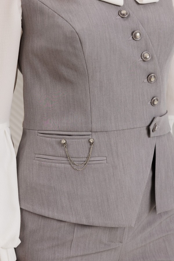 длина жилета: 56,4 см длина брюк: 107см рост: 164 см Материал: ПЭ 65% вискоза 33% спандекс 2% ОПИСАНИЕ ТЕХНИЧЕСКОЕ: Костюм женский, состоящий из брюк и жилета. Жилет полуприлегающего силуэта с рельефами по переду и спинке, отрезной по линии талии. Низ жилета ассиметричной формы. На баске с одной стороны обработаны прорезные карманы в рамку, один из которых функциональный. Застежка двубортная на петли-пуговицы и декоративную пату. Жилет на подкладке. Брюки прямые, сверху на притачном поясе, сзади с резинкой. На передних половинках обработаны карманы. Застежка на тесьму-молнию. Данный комплект можно дополнить блузой, что позволит Вам создать разные образыТаблица измерений изделия в готовом виде
