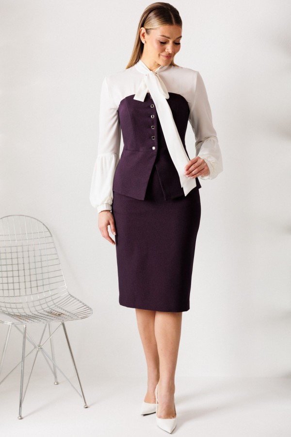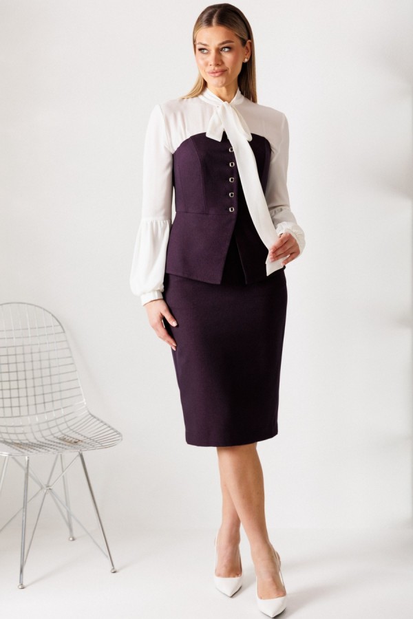 длина спинки корсета: 33 см длина юбки: 68 см рост: 164 см Материал: корсет, юбка: полиэстер 96% спандекс 4% ОПИСАНИЕ ТЕХНИЧЕСКОЕ: Этот нарядный костюм представляет собой элегантное и утонченное решение для особых случаев. Костюм состоит из корсета и юбки. Топ-корсет прилегающего силуэта с регилином по рельефам по переду и спинке, который обеспечивает дополнительную жёсткость и посадку на фигуре. Застёжка центральная бортовая на 6 петель и пуговиц. Низ переда фигурной заострённой формы, что подчёркивает элегантный силуэт. Модель идеально подходит для создания строгих, утонченных образов и может использоваться как в качестве элемента вечернего наряда, так и для повседневных образов с более нейтральными деталями. Наденьте его с нашей юбкой - это беспроигрышный дуэт, где игривость и строгость подчеркивают друг друга. Юбка прямая, зауженная к низу, сверху на притачном поясе. Застежка на тесьму-молнию в среднем шве, который переходит в шлицу. Костюм на подкладкеТаблица измерений изделия в готовом виде