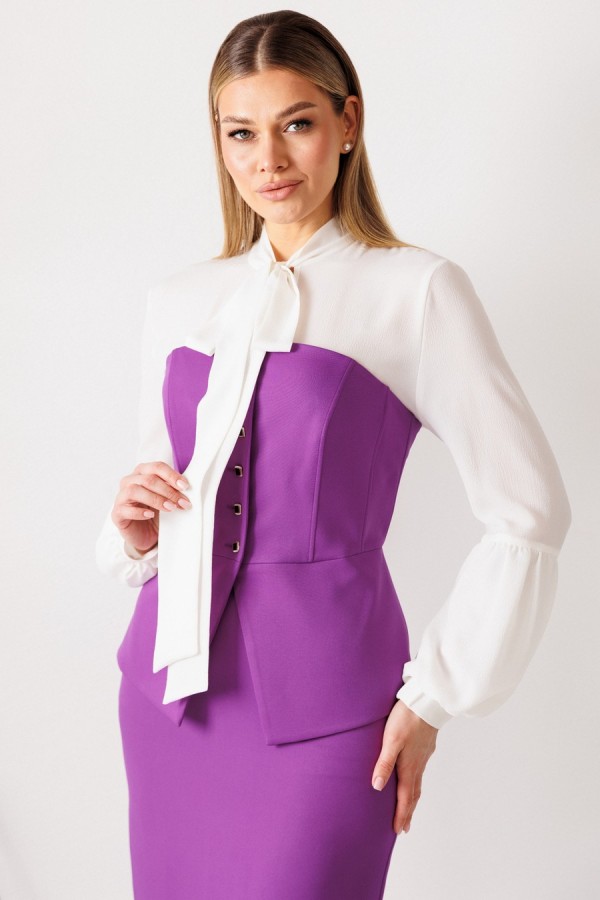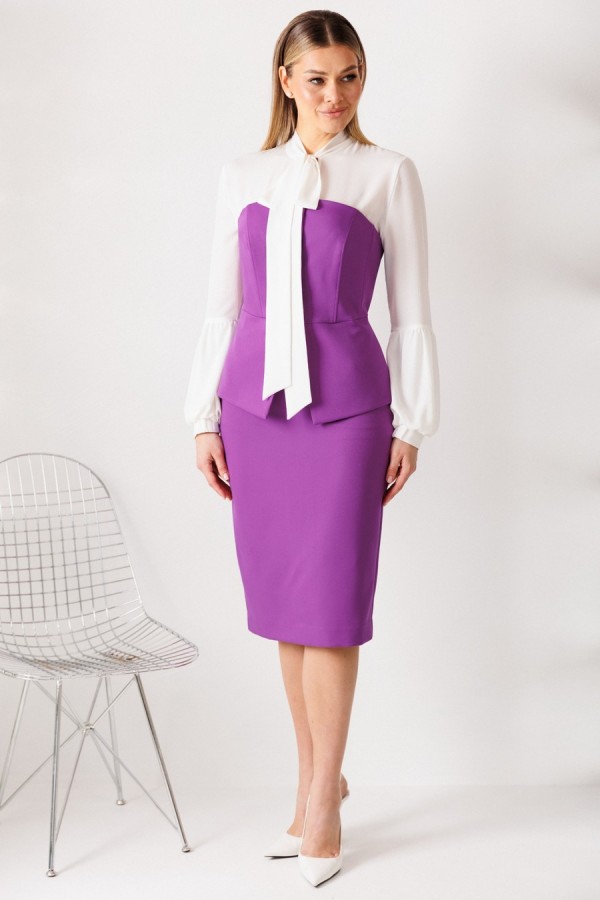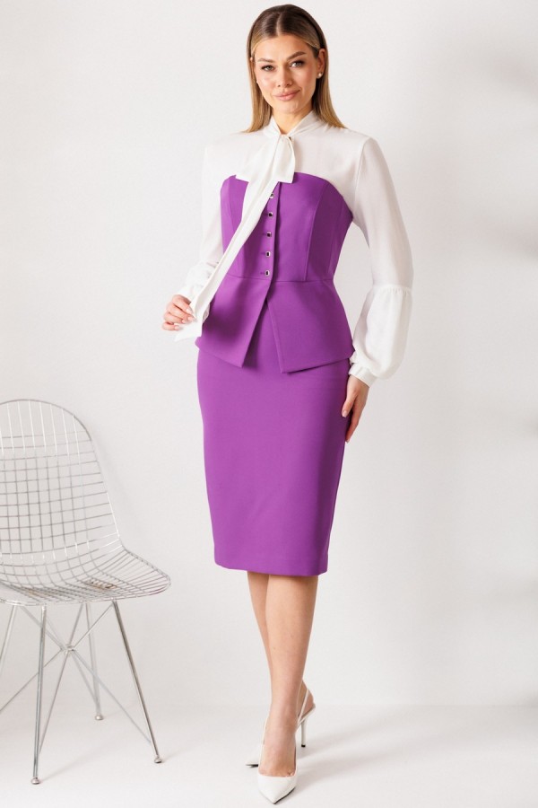 длина спинки корсета: 33 см длина юбки: 68 см рост: 164 см Материал: корсет, юбка: полиэстер 96% спандекс 4% ОПИСАНИЕ ТЕХНИЧЕСКОЕ: Этот нарядный костюм представляет собой элегантное и утонченное решение для особых случаев. Костюм состоит из корсета и юбки. Топ-корсет прилегающего силуэта с регилином по рельефам по переду и спинке, который обеспечивает дополнительную жёсткость и посадку на фигуре. Застёжка центральная бортовая на 6 петель и пуговиц. Низ переда фигурной заострённой формы, что подчёркивает элегантный силуэт. Модель идеально подходит для создания строгих, утонченных образов и может использоваться как в качестве элемента вечернего наряда, так и для повседневных образов с более нейтральными деталями. Наденьте его с нашей юбкой - это беспроигрышный дуэт, где игривость и строгость подчеркивают друг друга. Юбка прямая, зауженная к низу, сверху на притачном поясе. Застежка на тесьму-молнию в среднем шве, который переходит в шлицу. Костюм на подкладкеТаблица измерений изделия в готовом виде